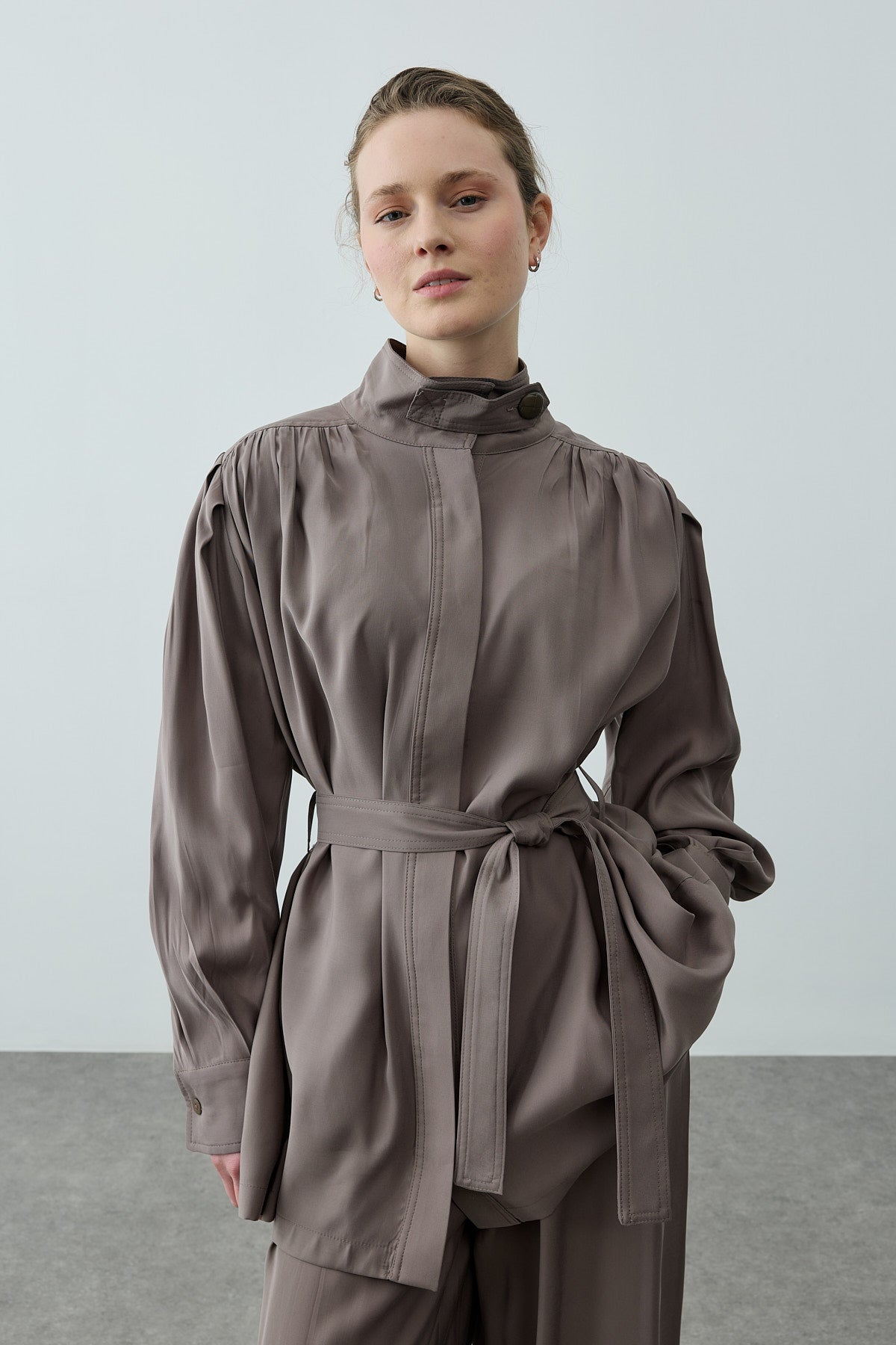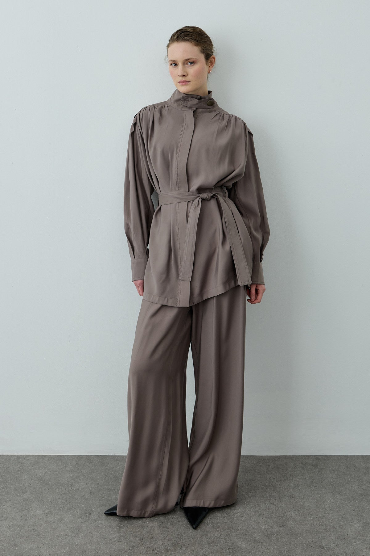 مجموعة أنيقة تتألف من قميص بطوق مستقيم وإغلاق بأزرار أمامية وأكمام طويلة وأصفاد وحزام قابل للتعديل وجيوب، مصنوعة من قماش تينسيل المنسوج. مع بنطلون واسع بتصميم بالازو وإغلاق بسحاب وأزرار وطيات.