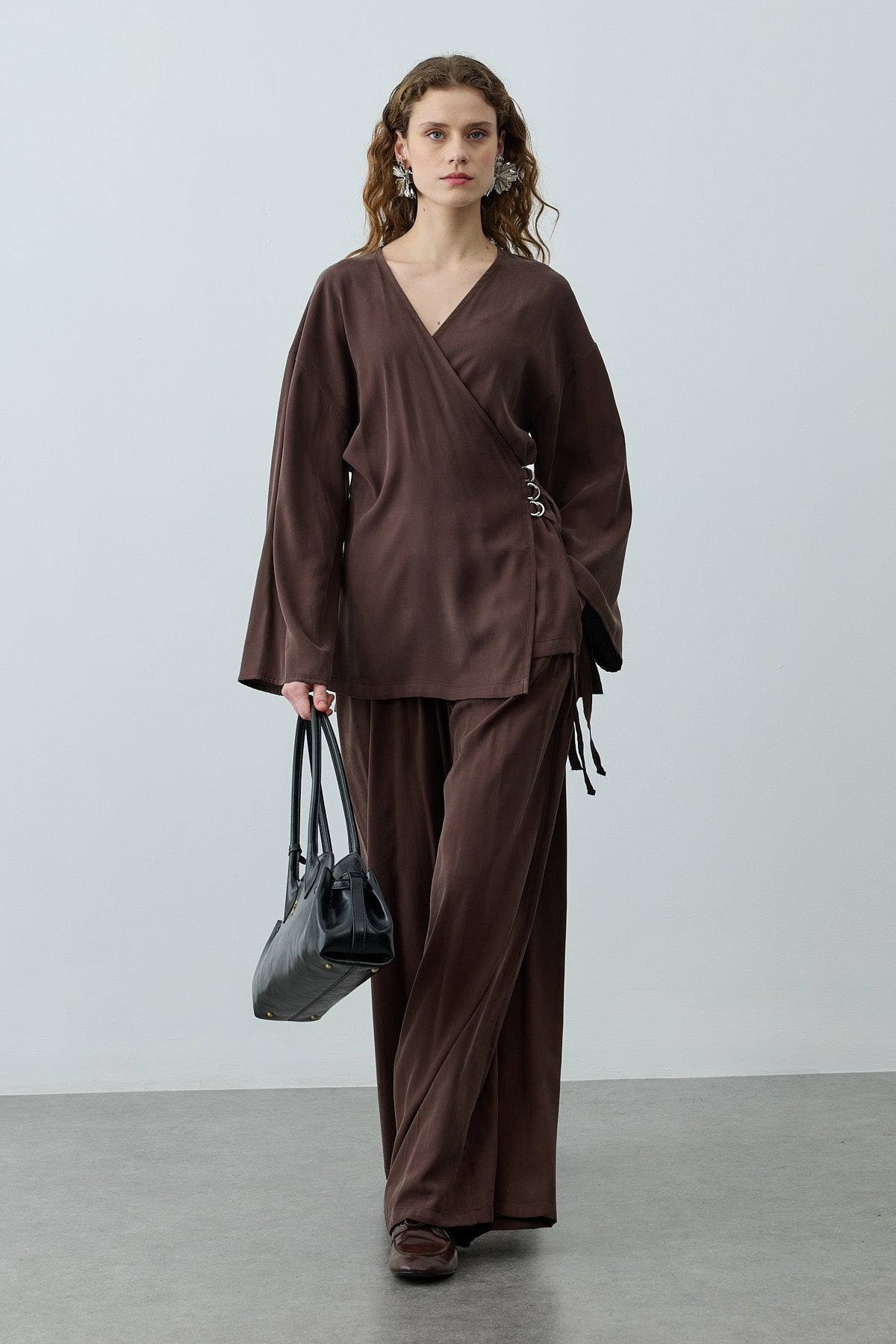 مجموعة كيمونو مصنوعة من قماش تينسل المنسوج، بتصميم كيمونو، حزام بثلاثة أزرار مع مشبك معدني، أكمام كيمونو واسعة، خصر مطاطي، وسراويل واسعة مع جيوب.