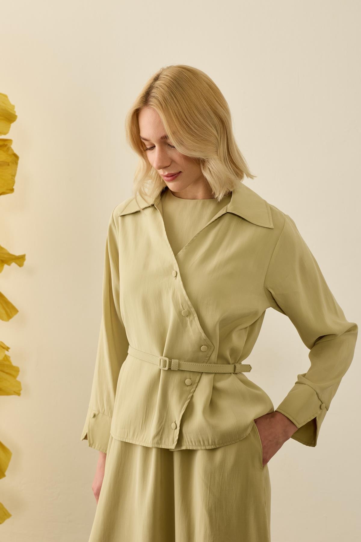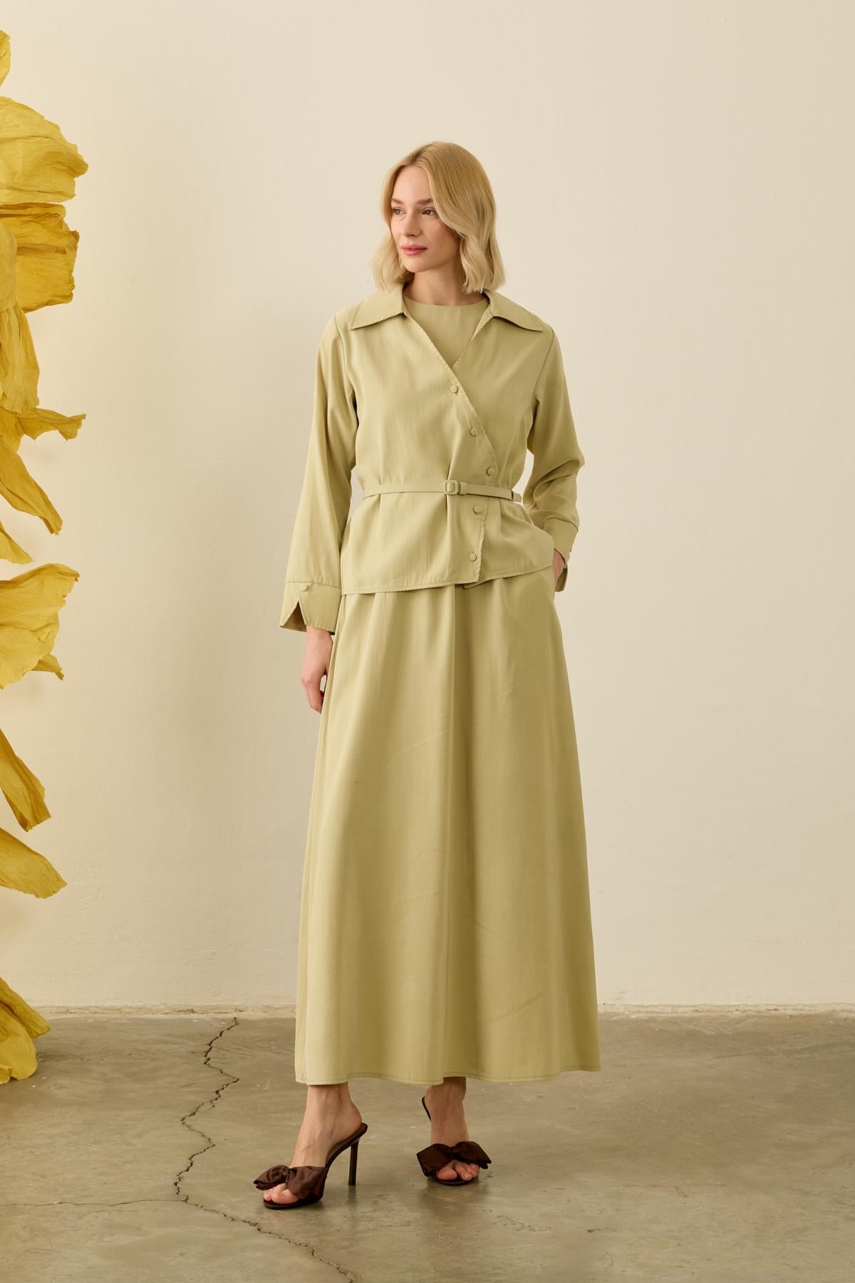 العلامات: button-up, chic set, lounge wear, modal fabric, sage green, slip dress, wrap dress