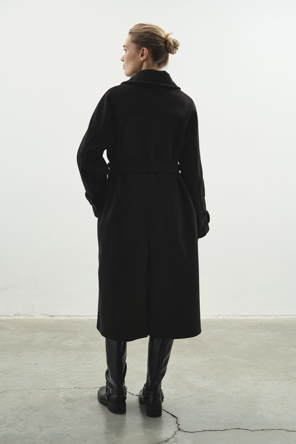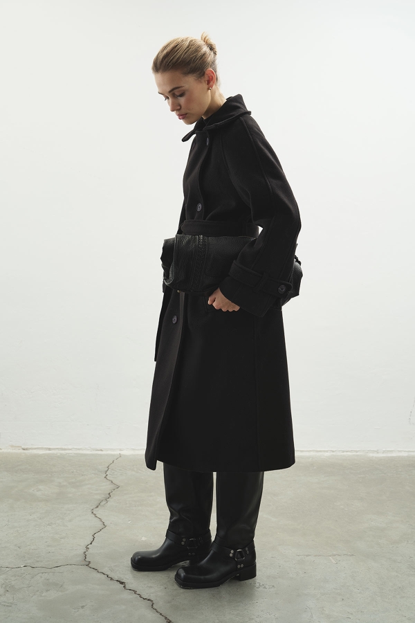 يقدم هذا المعطف المصنوع من خليط الصوف ملمسًا دافئًا وناعمًا، بينما يعمل حزام الخصر على إبراز القوام بأناقة. خطوطه النظيفة تخلق بساطة عصرية، وشكله المتدفق يضيف أناقة طبيعية ومتطورة للستايل الحضري.