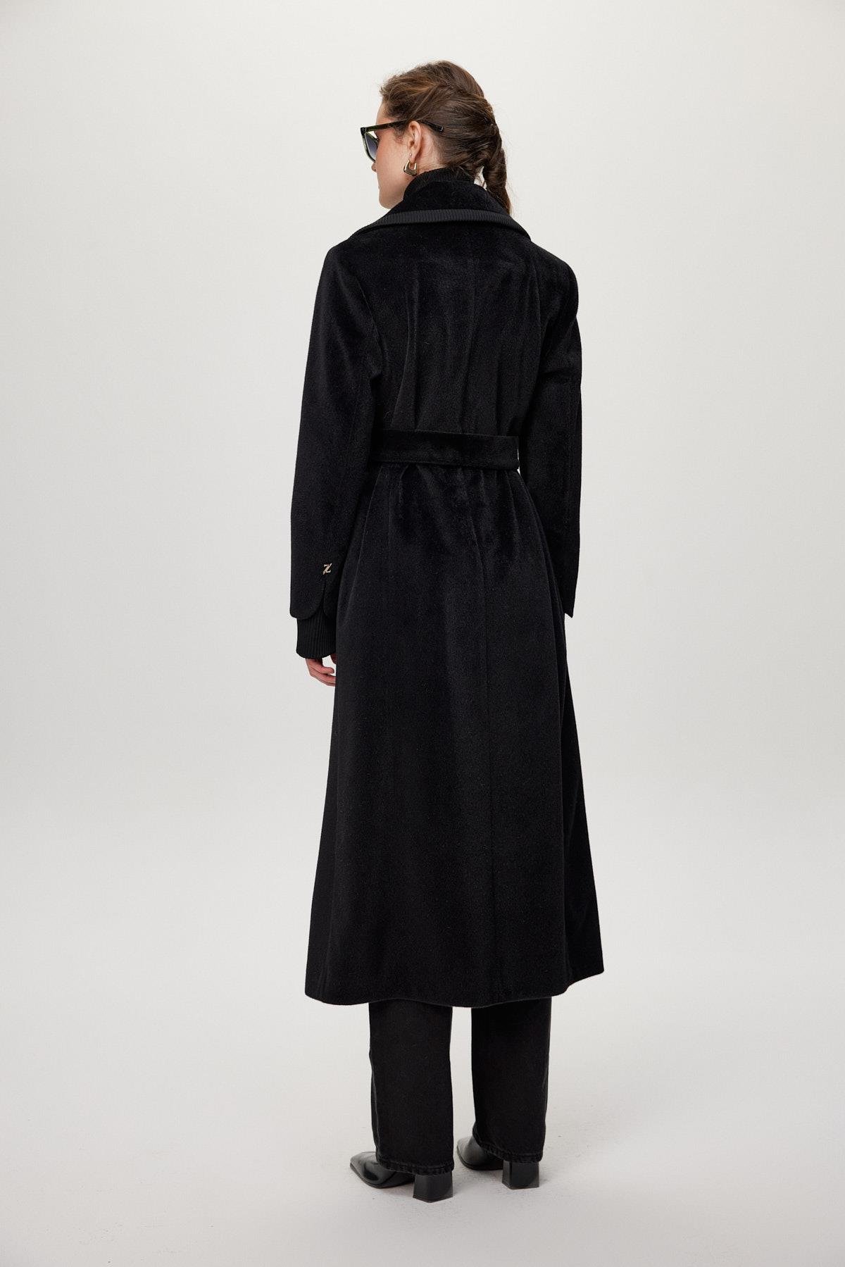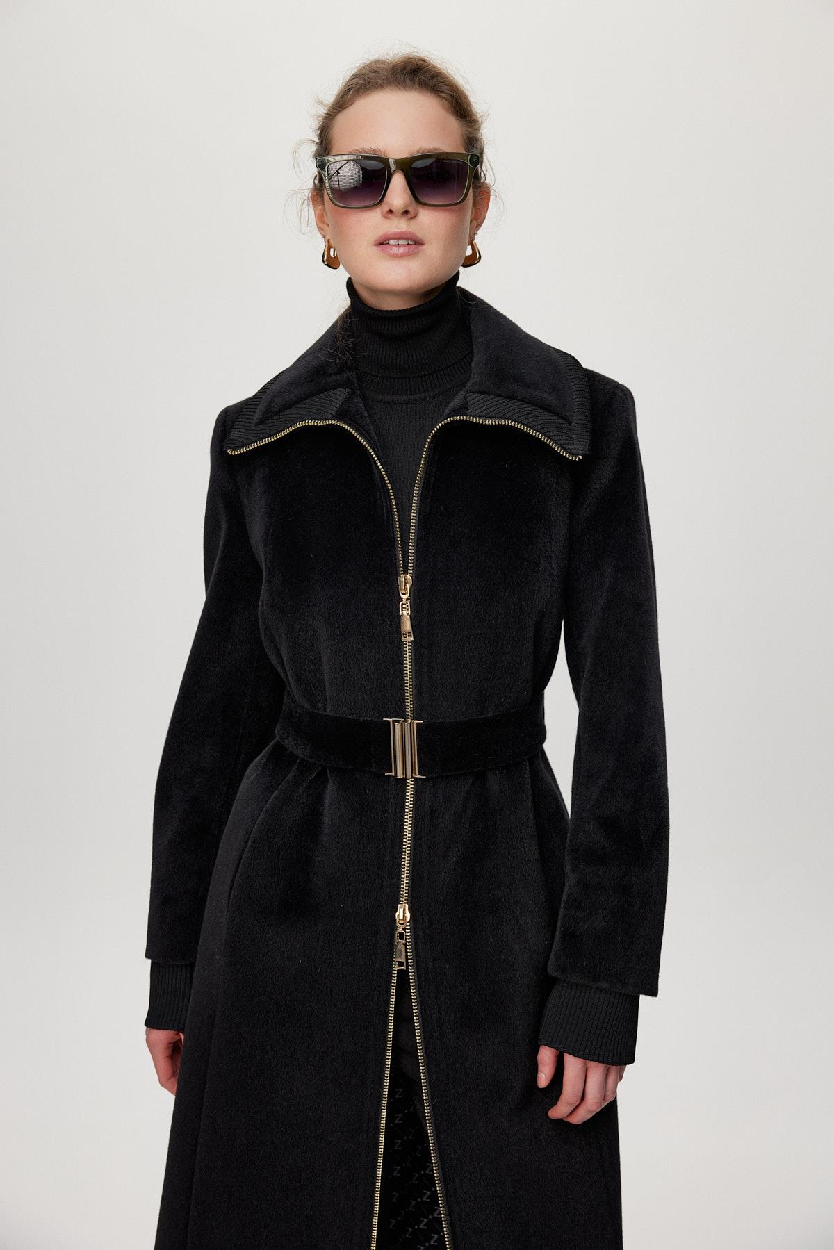 معطف أسود فروي بتفاصيل سحاب وحزام 14000