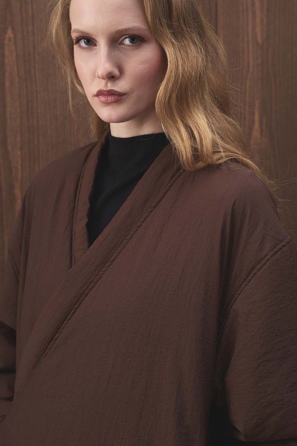 معطف القهوة المنفوخ ذو الرباط الملتف
