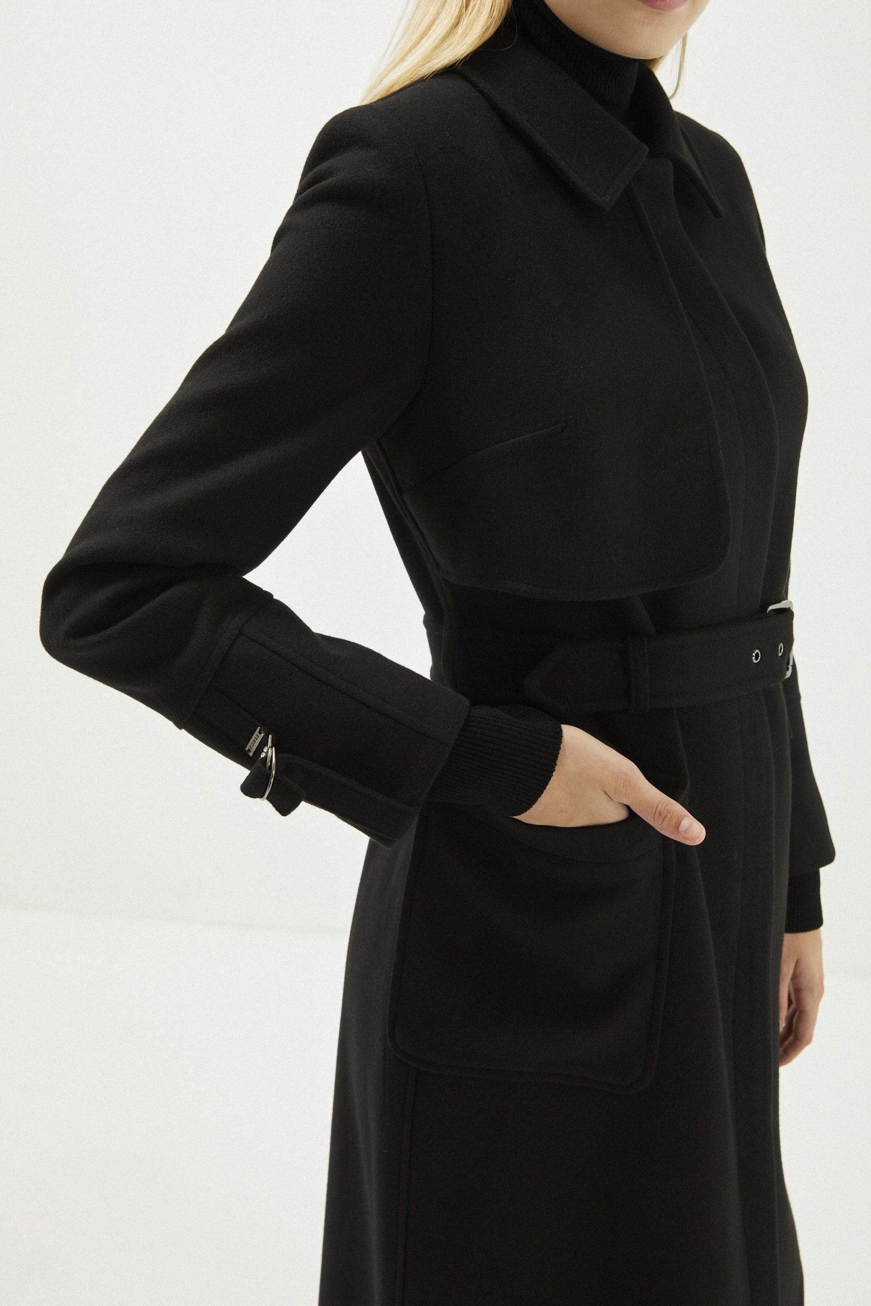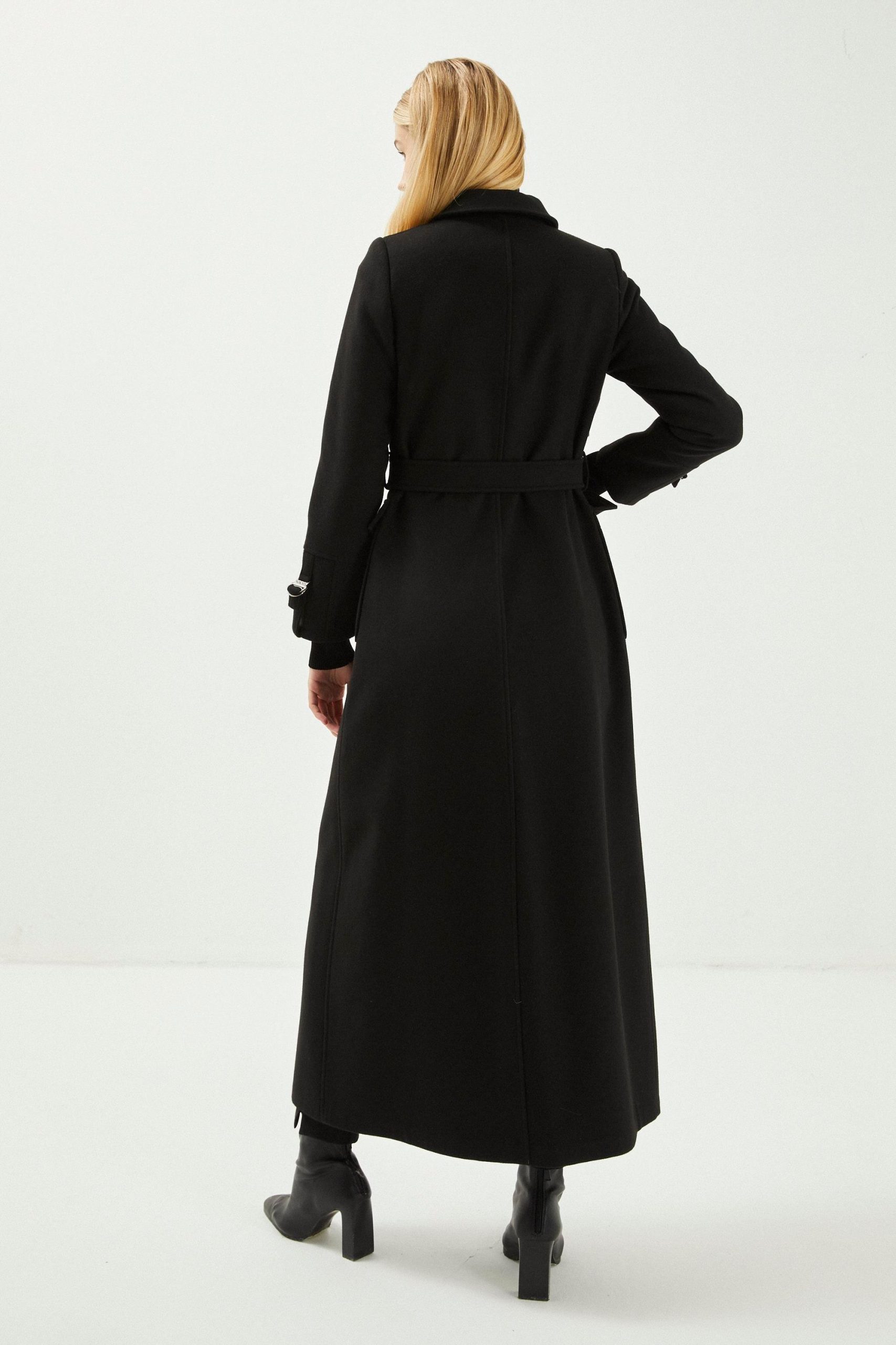 معطف الكشمير الأسود ذو الياقة القميصية وتفاصيل الحزام 13359