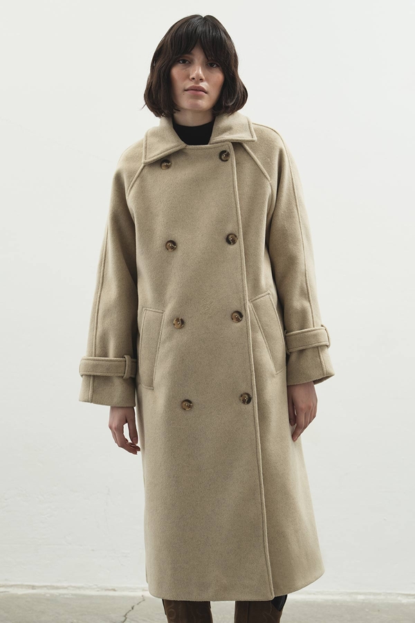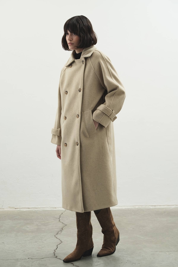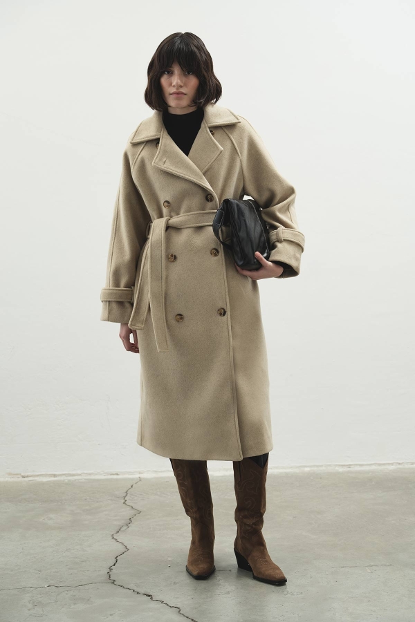 يقدم هذا المعطف المصنوع من خليط الصوف ملمسًا دافئًا وناعمًا، بينما يعمل حزام الخصر على إبراز القوام بأناقة. خطوطه النظيفة تخلق بساطة عصرية، وشكله المتدفق يضيف أناقة طبيعية ومتطورة للستايل الحضري.