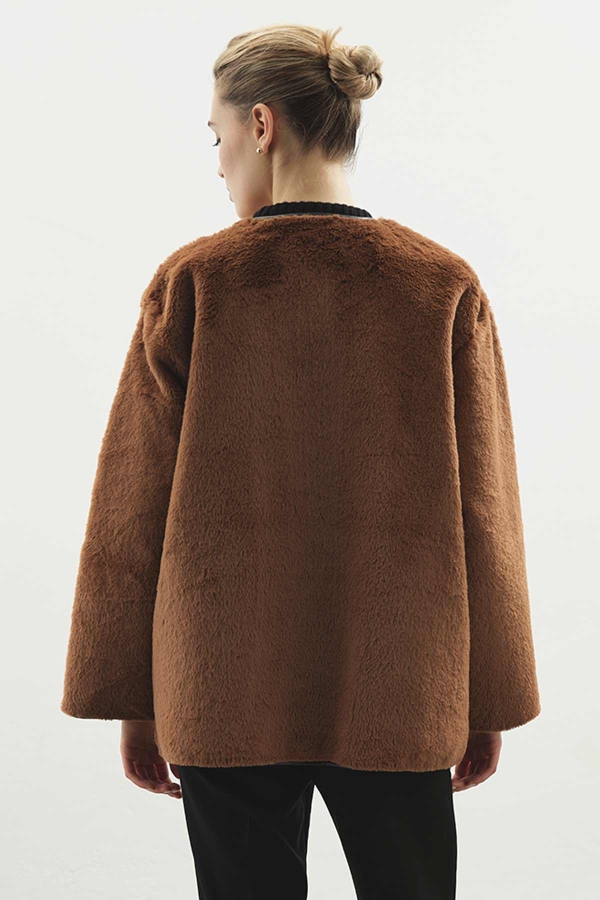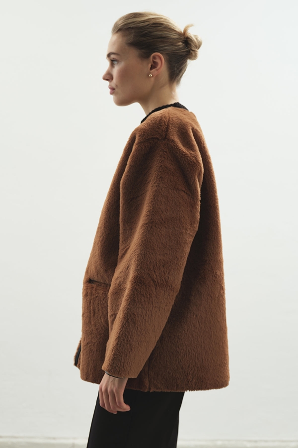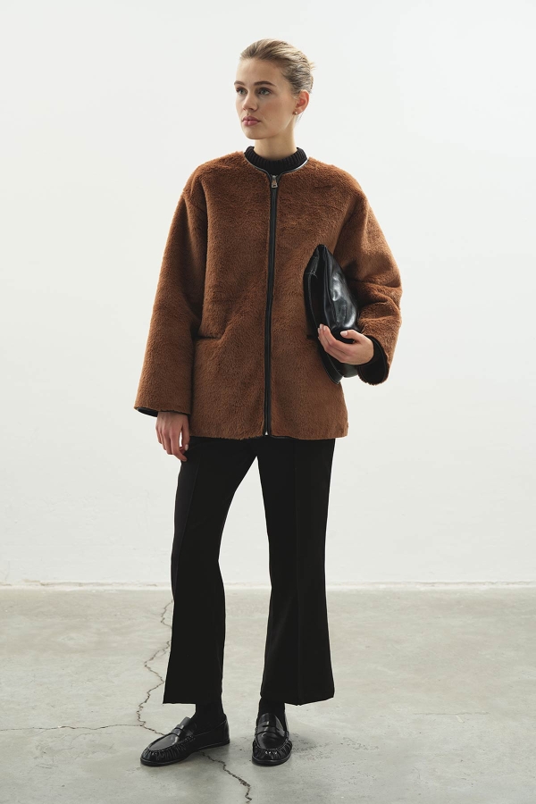 معطف بني فاتح بفرو ناعم وتفاصيل جلدية متباينة