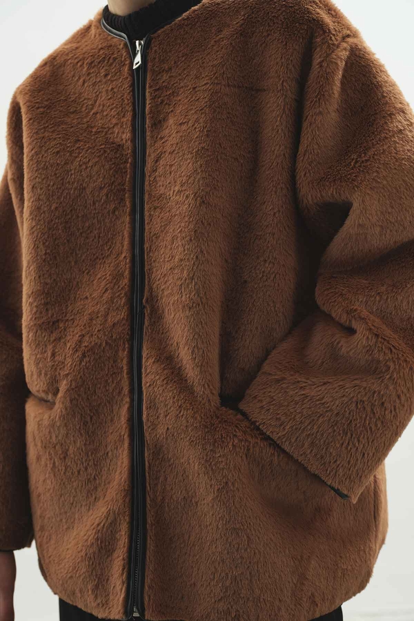 ياقة دراجة، إغلاق بسحاب، جيوب أمامية، يحتوي على حقيبة جيب قابلة للفصل يمكن فتحها بعناية للاستخدام النشط عند الحاجة، مقاس مريح، تفاصيل داخلية من الجلد، معطف فرو ناعم بتفاصيل جلدية متباينة بدون بطانة.