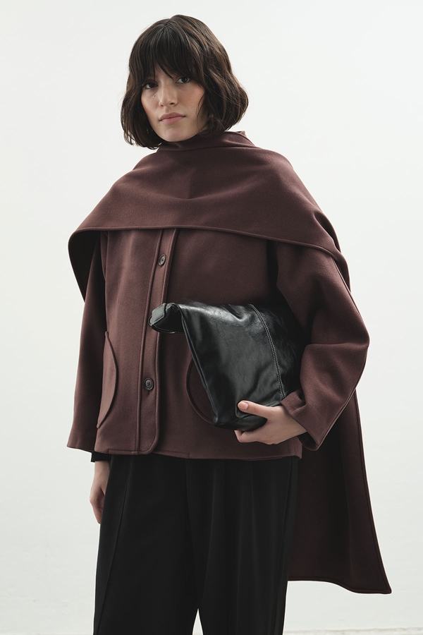 معطف بورجوندي ذو قلنسوة ومنديل بمظهر الكشمير