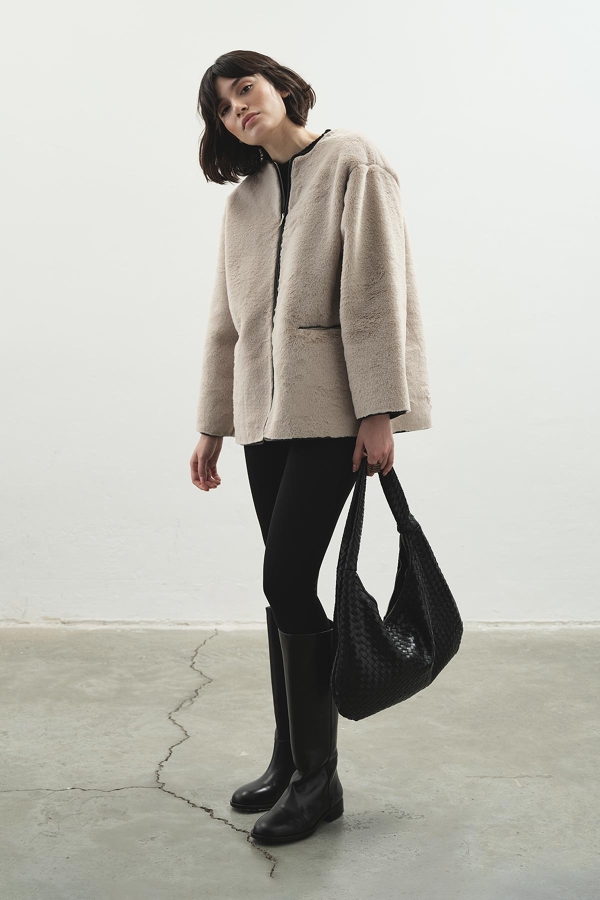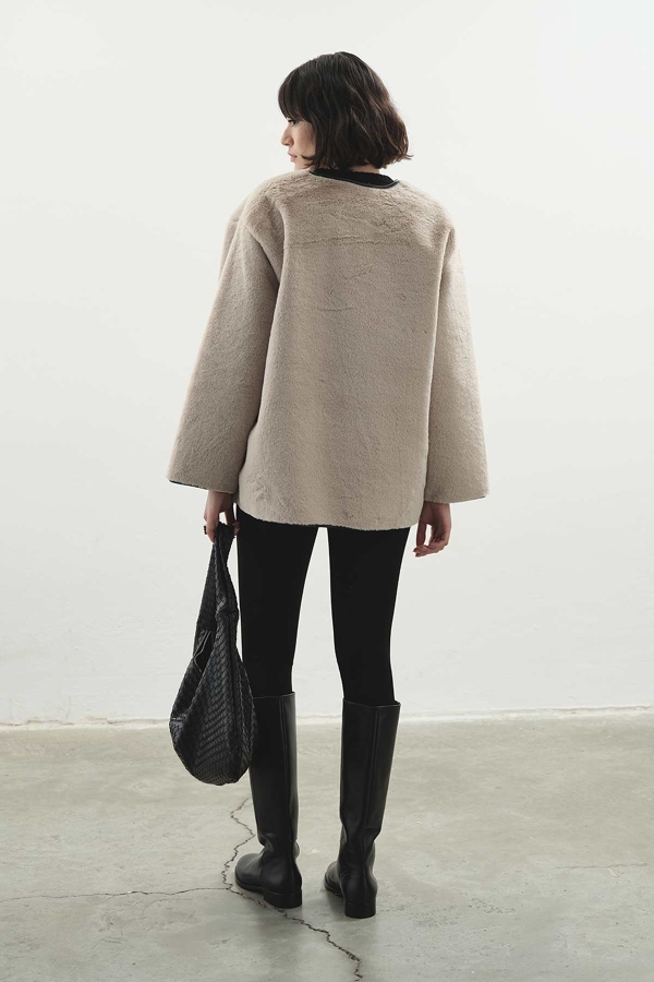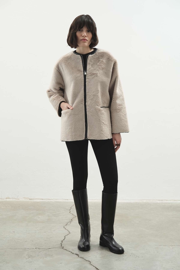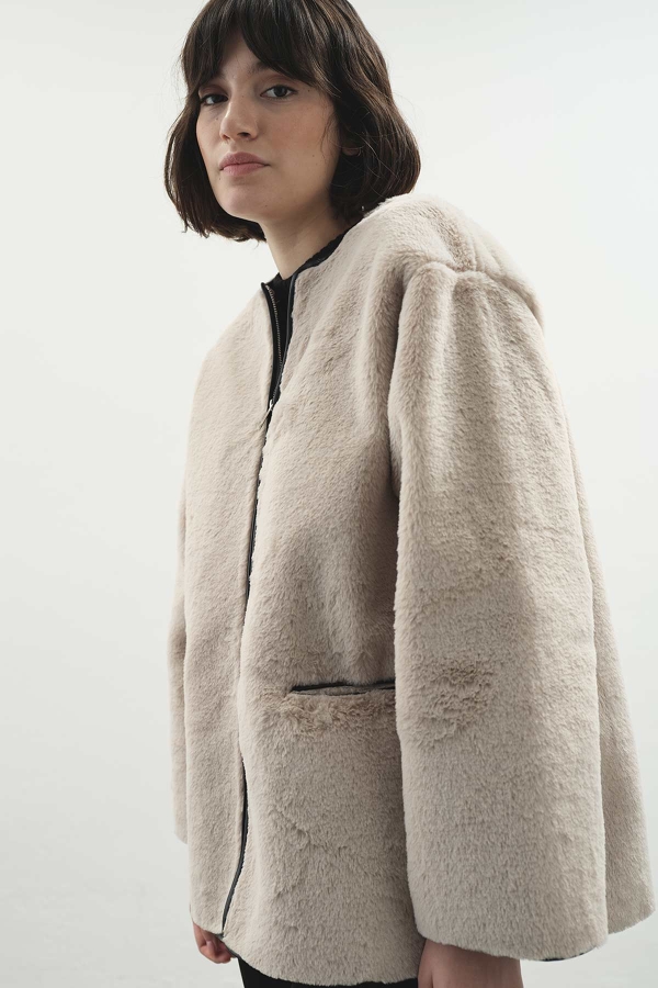 ياقة قائمة، إغلاق بسحاب، جيوب أمامية، يحتوي على جيب رقعة اختياري يمكن فتحه بعناية للاستخدام، قصة مريحة، تفاصيل جلدية في الداخل، معطف فراء صناعي غير مبطن بتفاصيل جلدية متباينة.