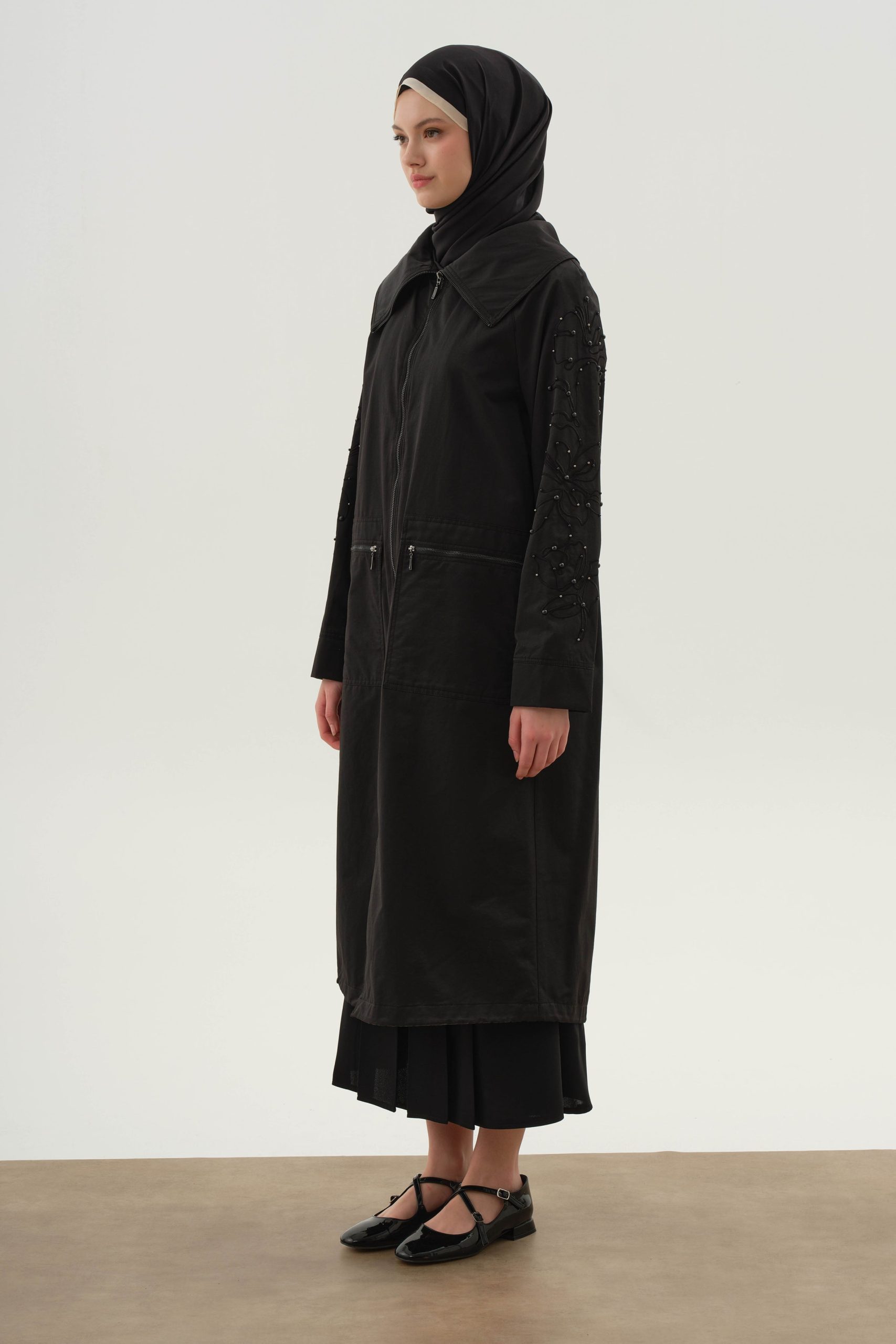 معطف ترنش مطرز ومزين باللؤلؤ – أسود