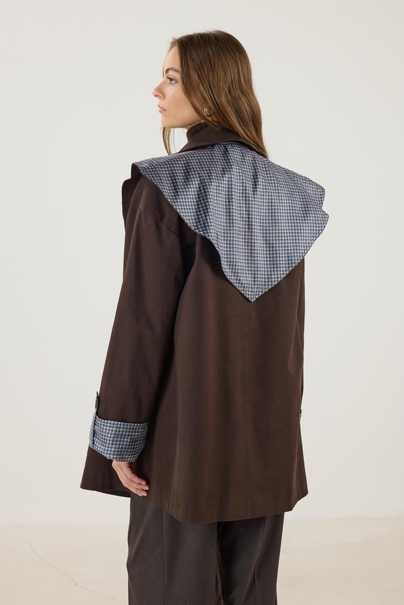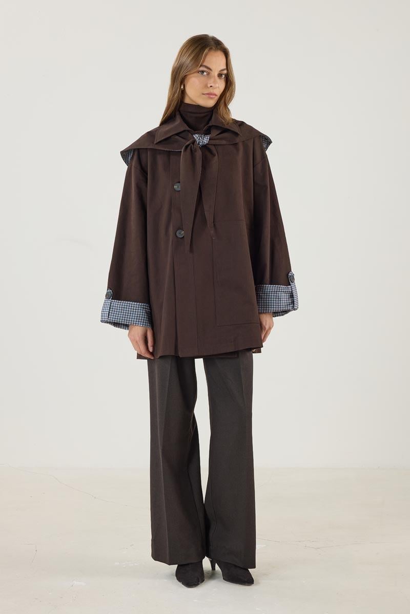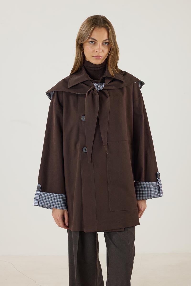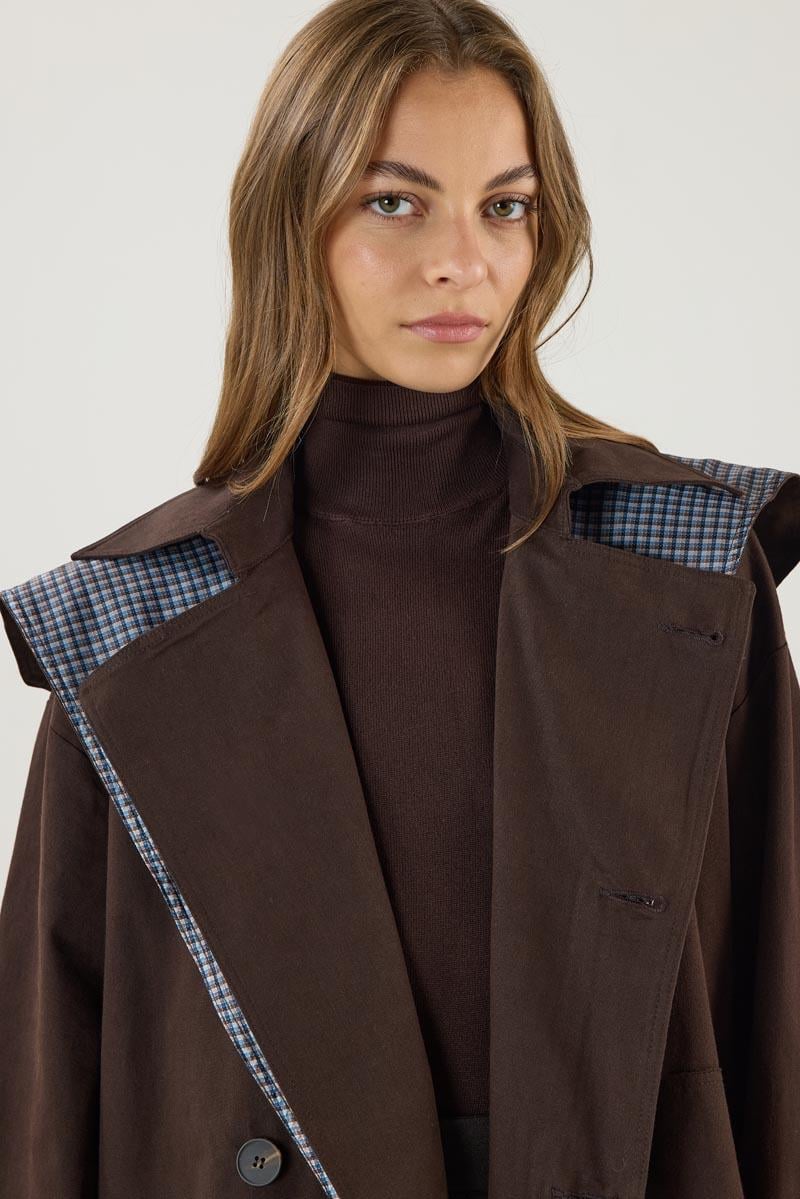 معطف ترينتش مبطن بالكتان بلون القهوة المر
