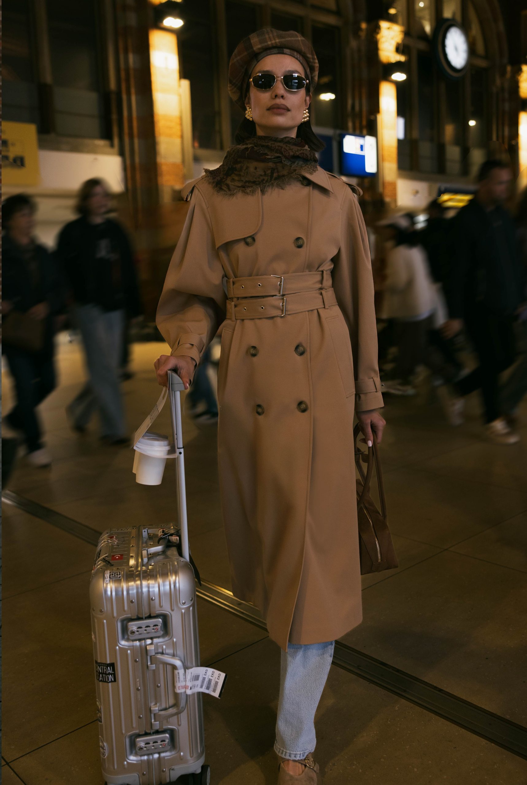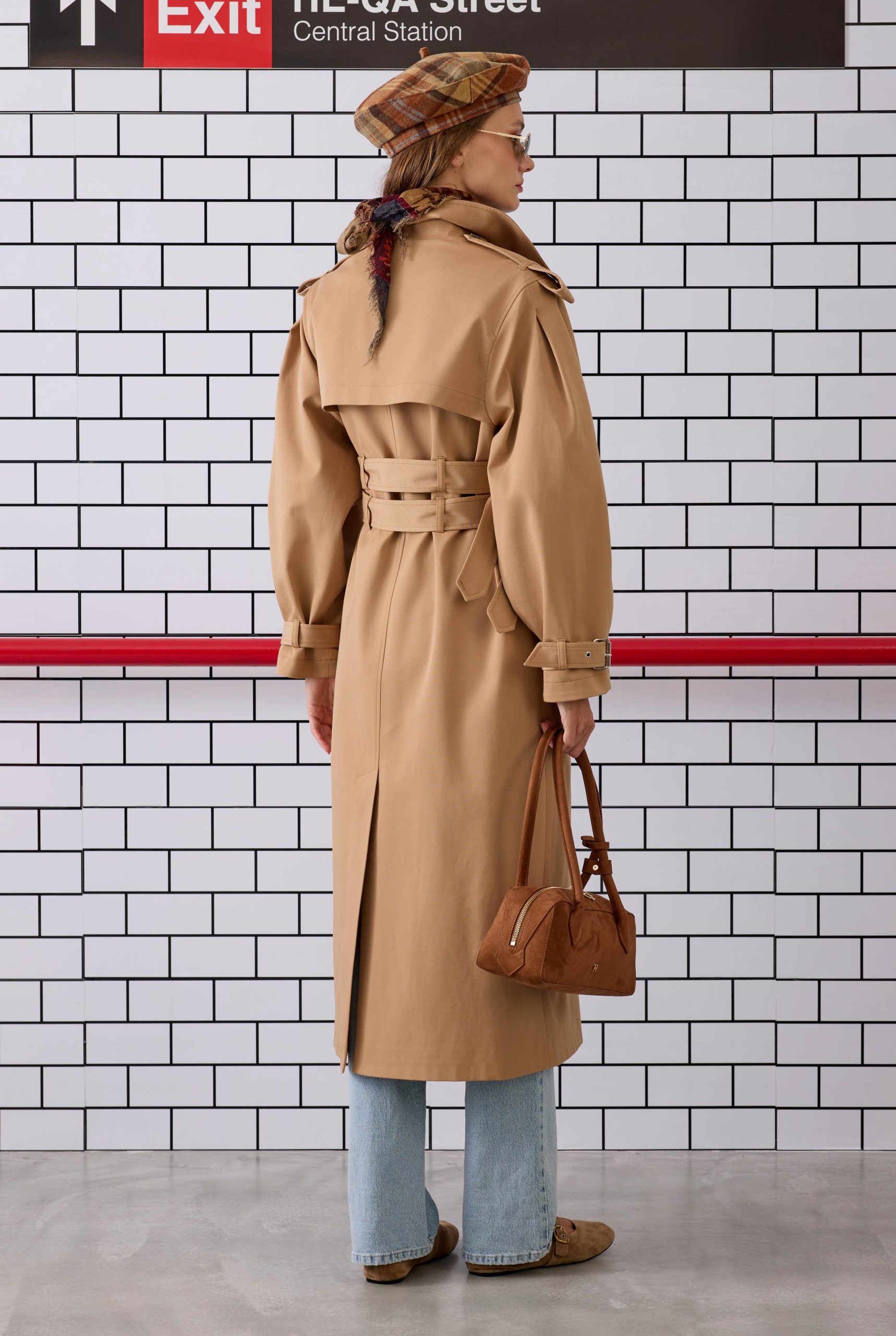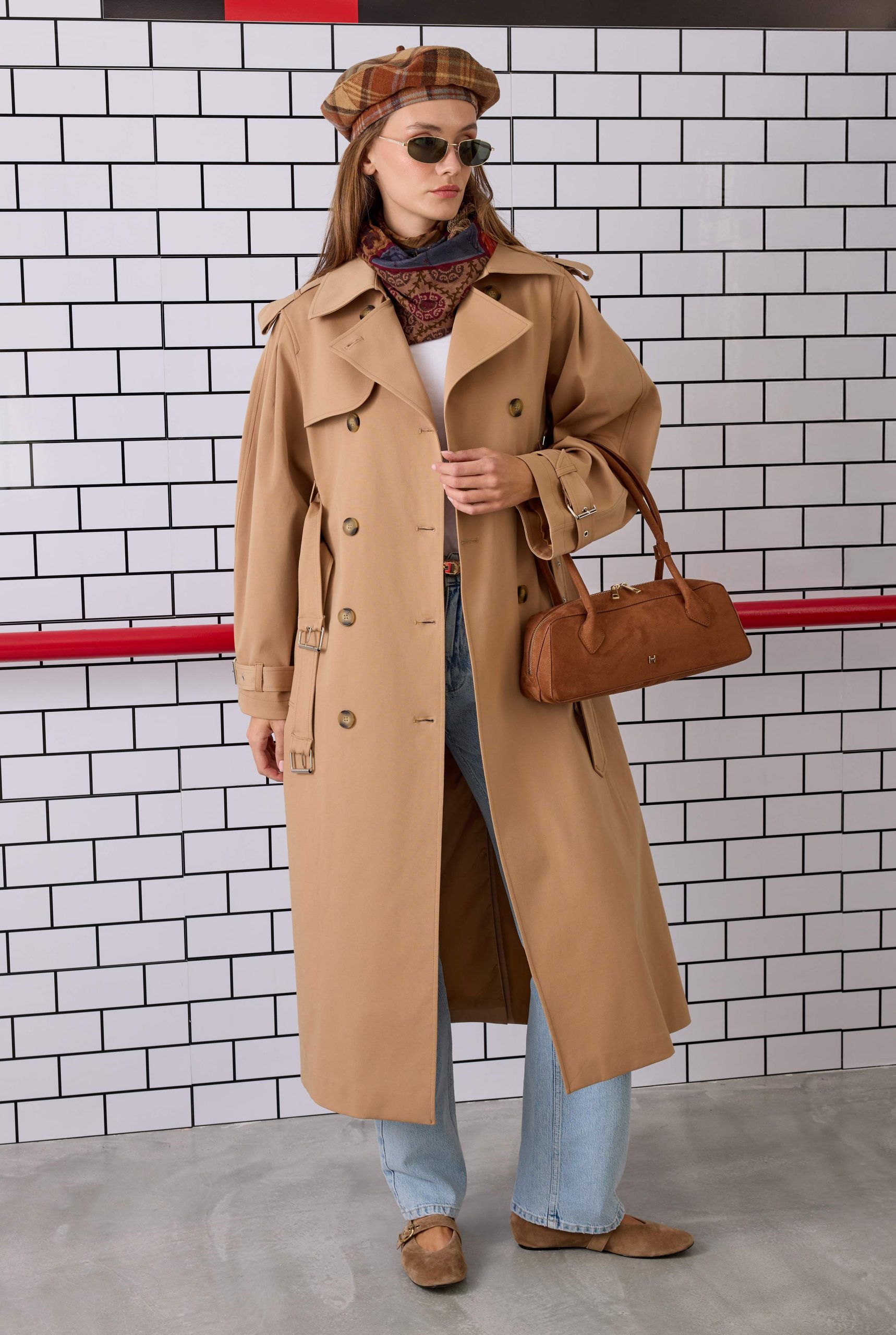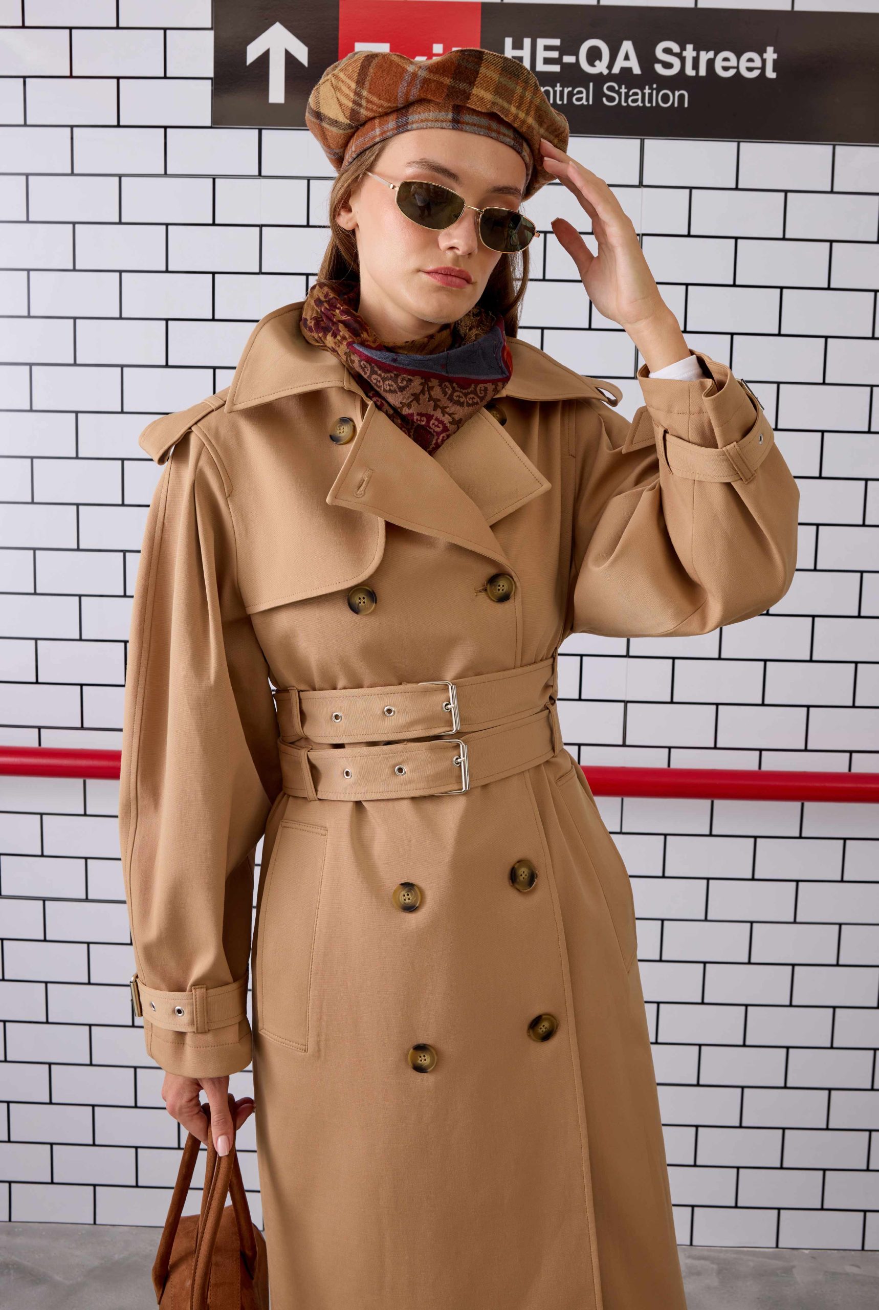 معطف ترينشو بمنطقة خصر مزدوجة بلون كاميل