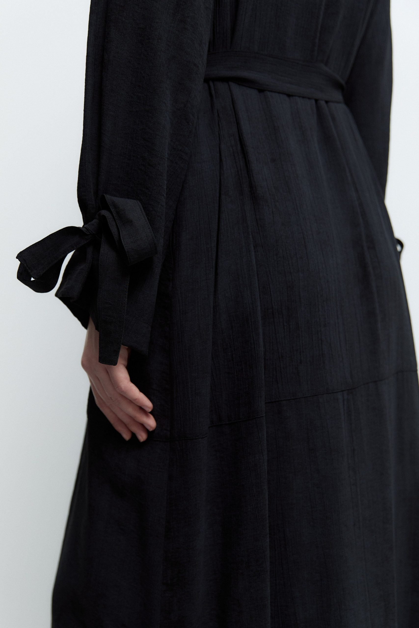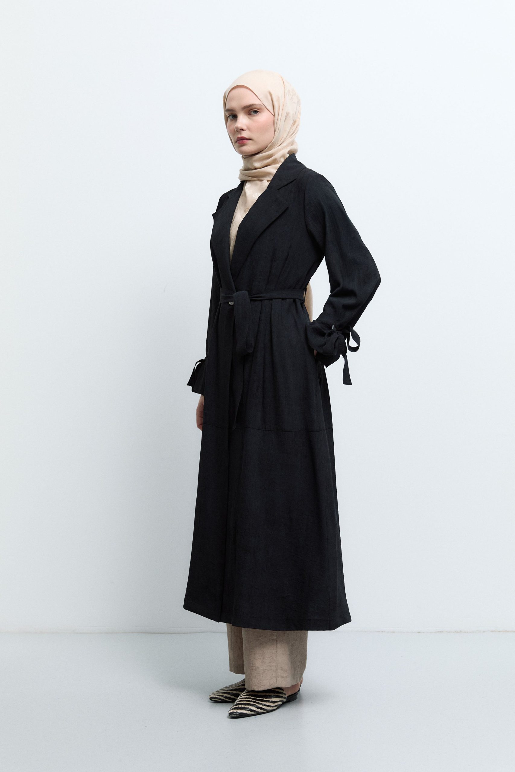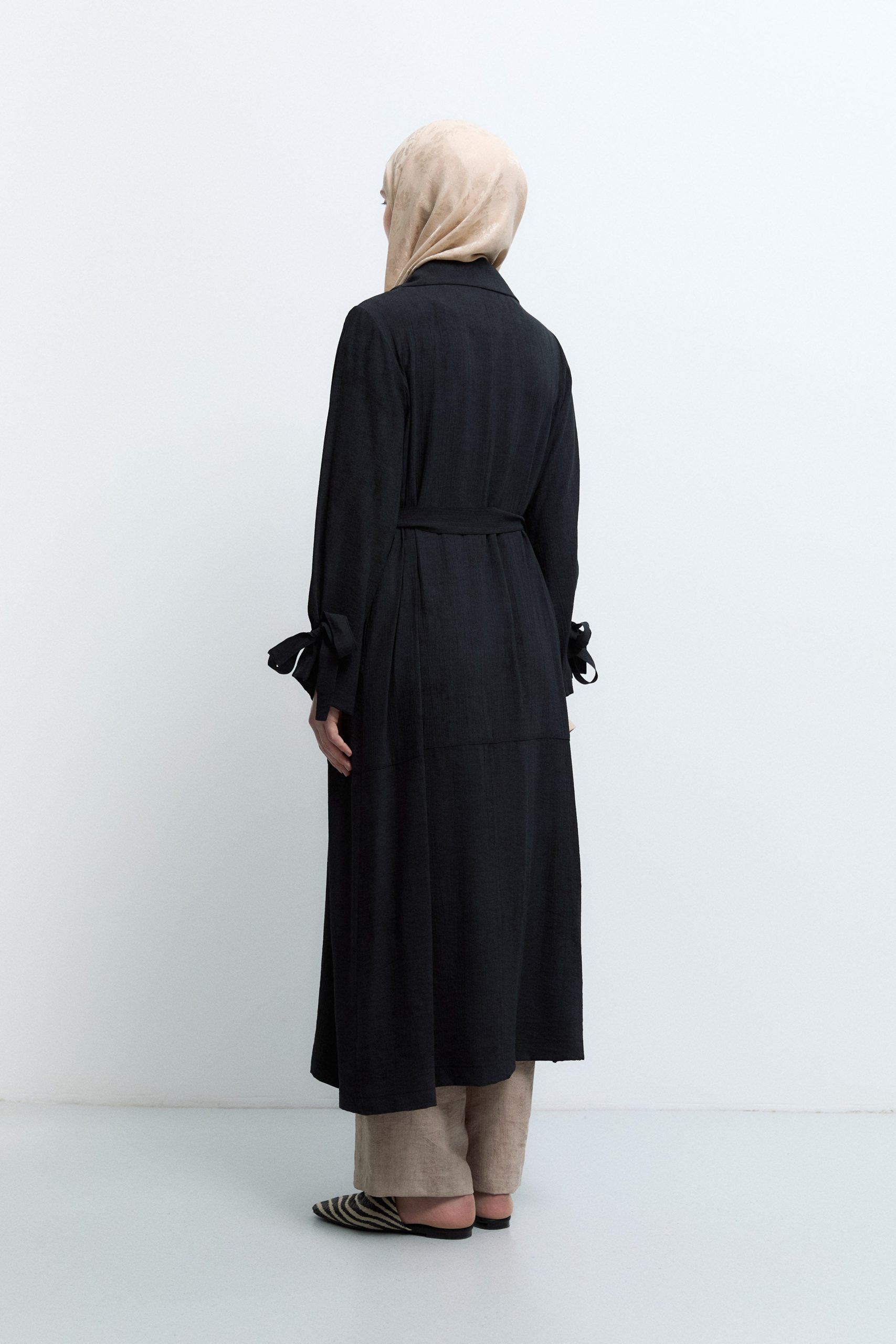 معطف ترينش أسود بتفاصيل أكمام مربوطة