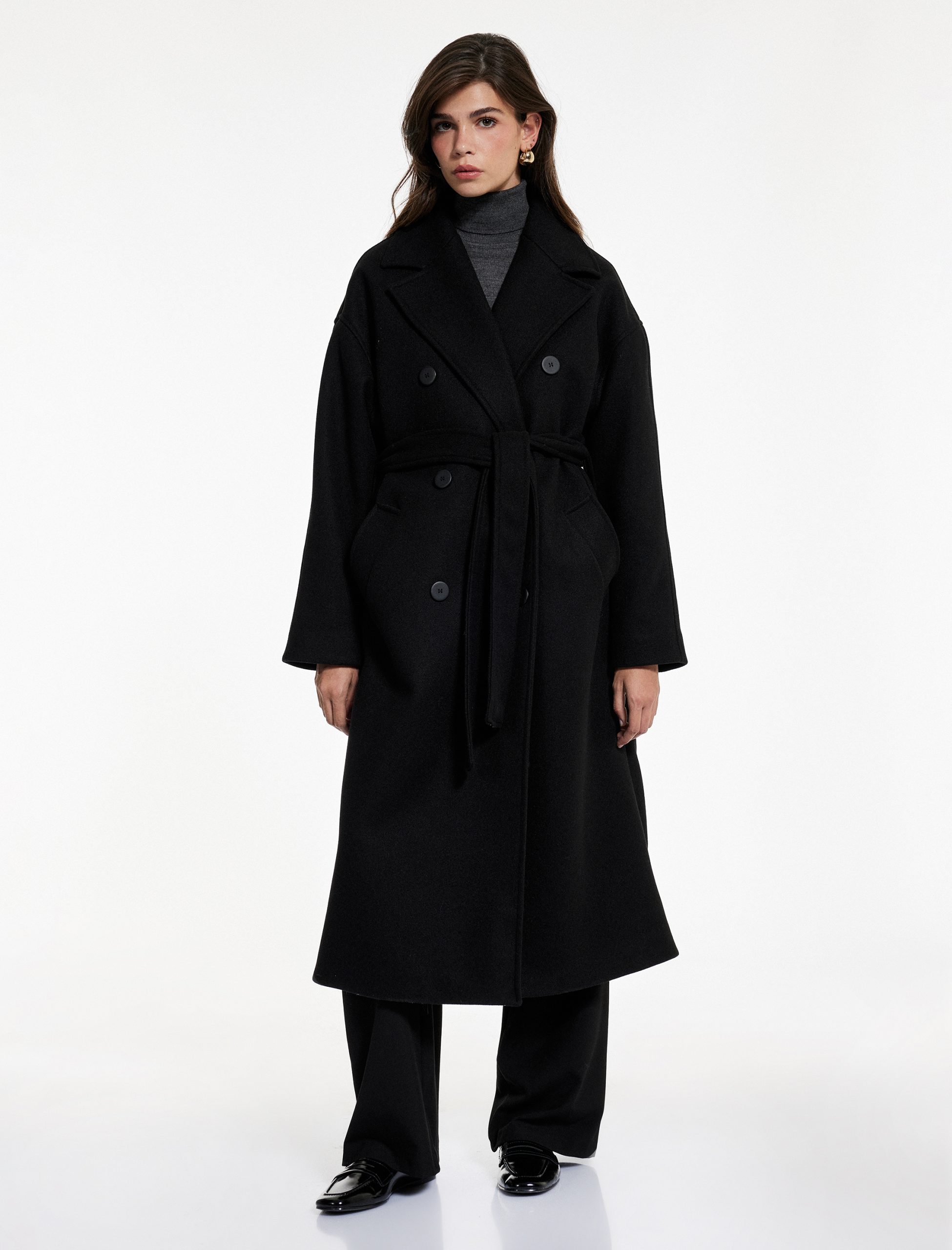 معطف ترينش بأكمام طويلة وأزرار وجيوب وتصميم ملفوف بحزام