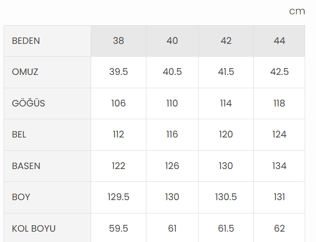 جدول المقاسات: {’38’: {‘الكتف’: 39.5, ‘الصدر’: 106, ‘الخصر’: 112, ‘الورك’: 122, ‘الطول’: 129.5, ‘طول الكم’: 59.5}, ’40’: {‘الكتف’: 40.5, ‘الصدر’: 110, ‘الخصر’: 116, ‘الورك’: 126, ‘الطول’: 130, ‘طول الكم’: 61}, ’42’: {‘الكتف’: 41.5, ‘الصدر’: 114, ‘الخصر’: 120, ‘الورك’: 130, ‘الطول’: 130.5, ‘طول الكم’: 61.5}, ’44’: {‘الكتف’: 42.5, ‘الصدر’: 118, ‘الخصر’: 124, ‘الورك’: 134, ‘الطول’: 131, ‘طول الكم’: 62}}