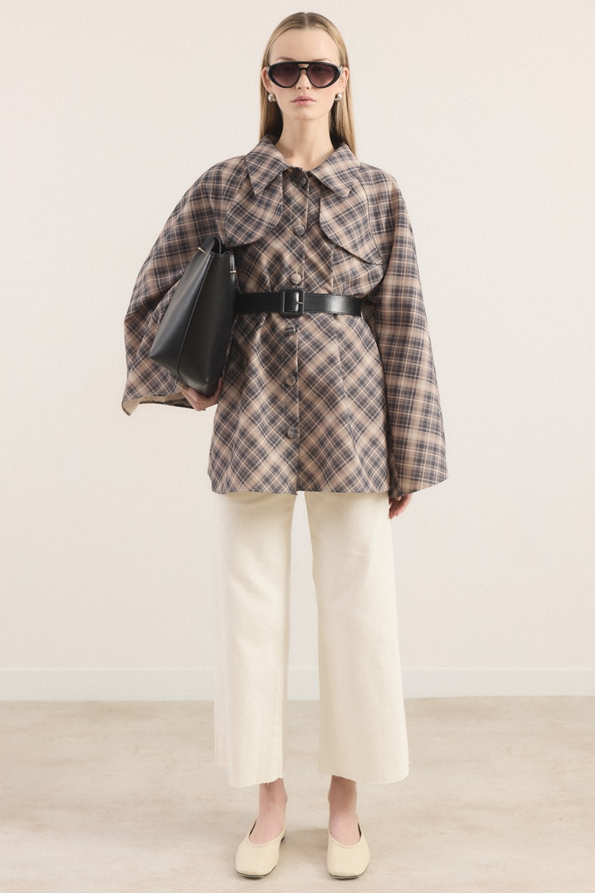 مصنوع من قماش مطبوع بنقشة مربعات، يتميز هذا المعطف الطويل بتصميمه القوي والعصري الذي يكمل أناقتك. يوفر تصميم الكم الإسباني الواسع قواماً ديناميكياً وجريئاً، بينما يبرز حزام الجلد الواسع منطقة الخصر لمظهر أنيق. تجمع تفاصيل أزرار اللفافة الأمامية بين خطوط معطف الترينش الكلاسيكية واللمسات العصرية. بطول 79 سم، يمكن ارتداؤه بسهولة مع فساتين وبناطيل مختلفة.