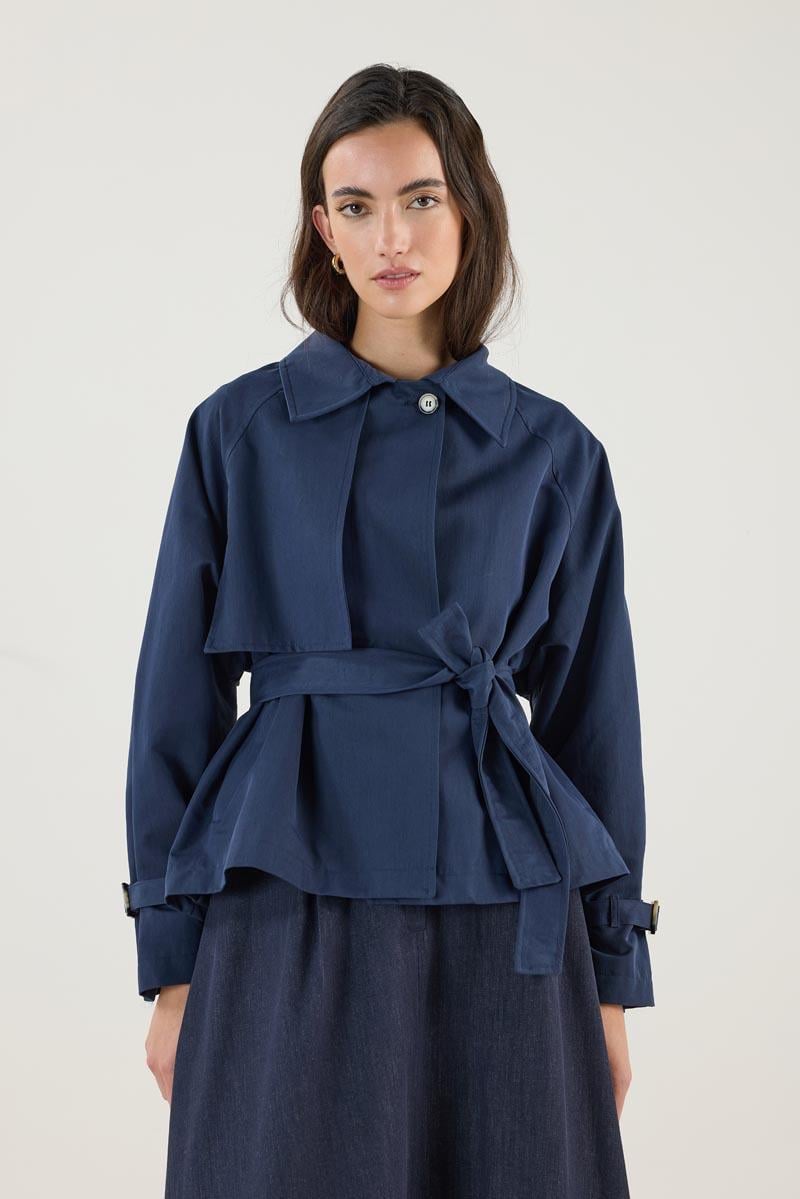 معطف ترينش قصير أزرق بحزام وجيوب