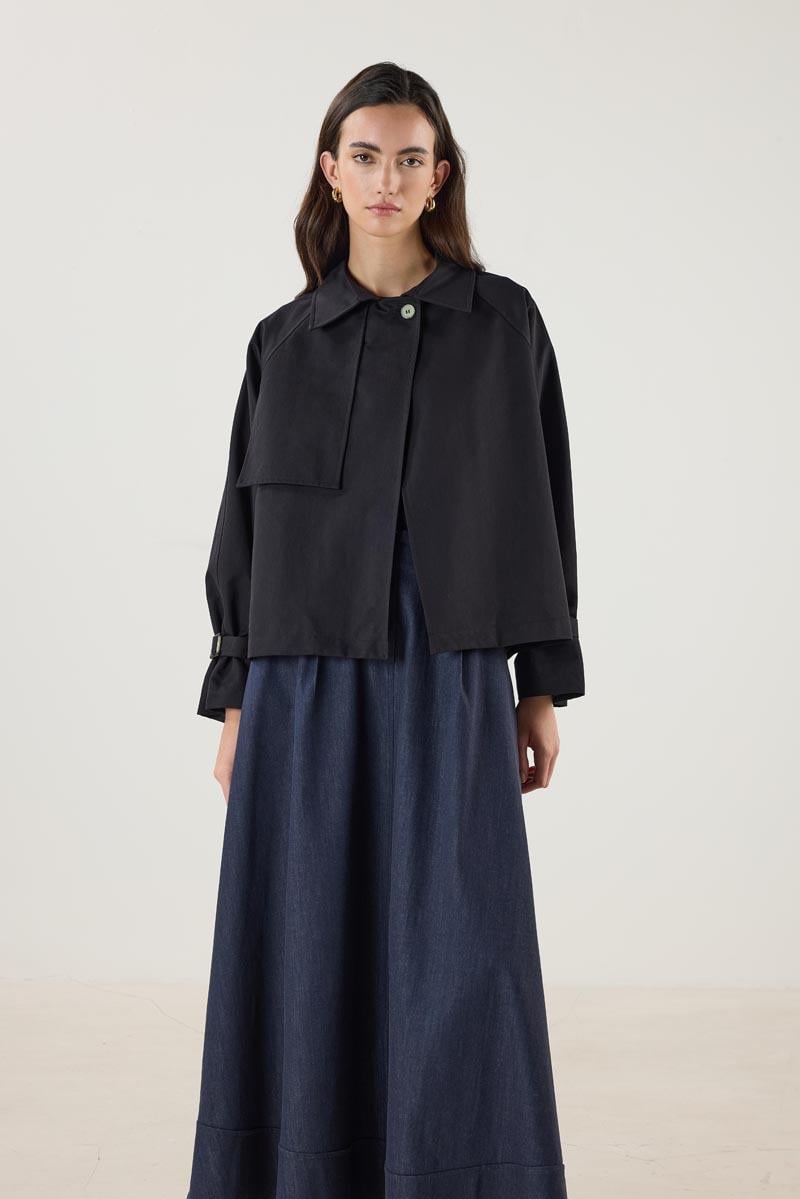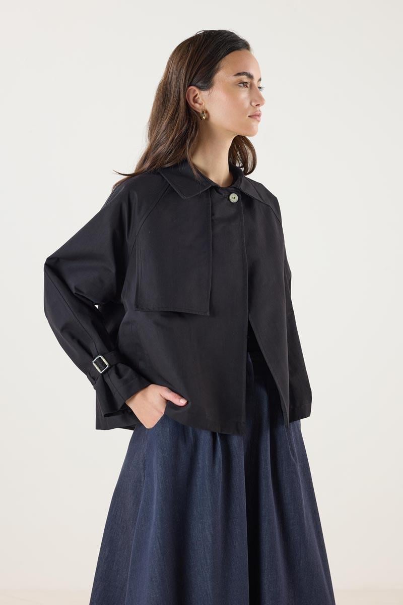 معطف ترينش قصير أسود مع حزام وجيوب