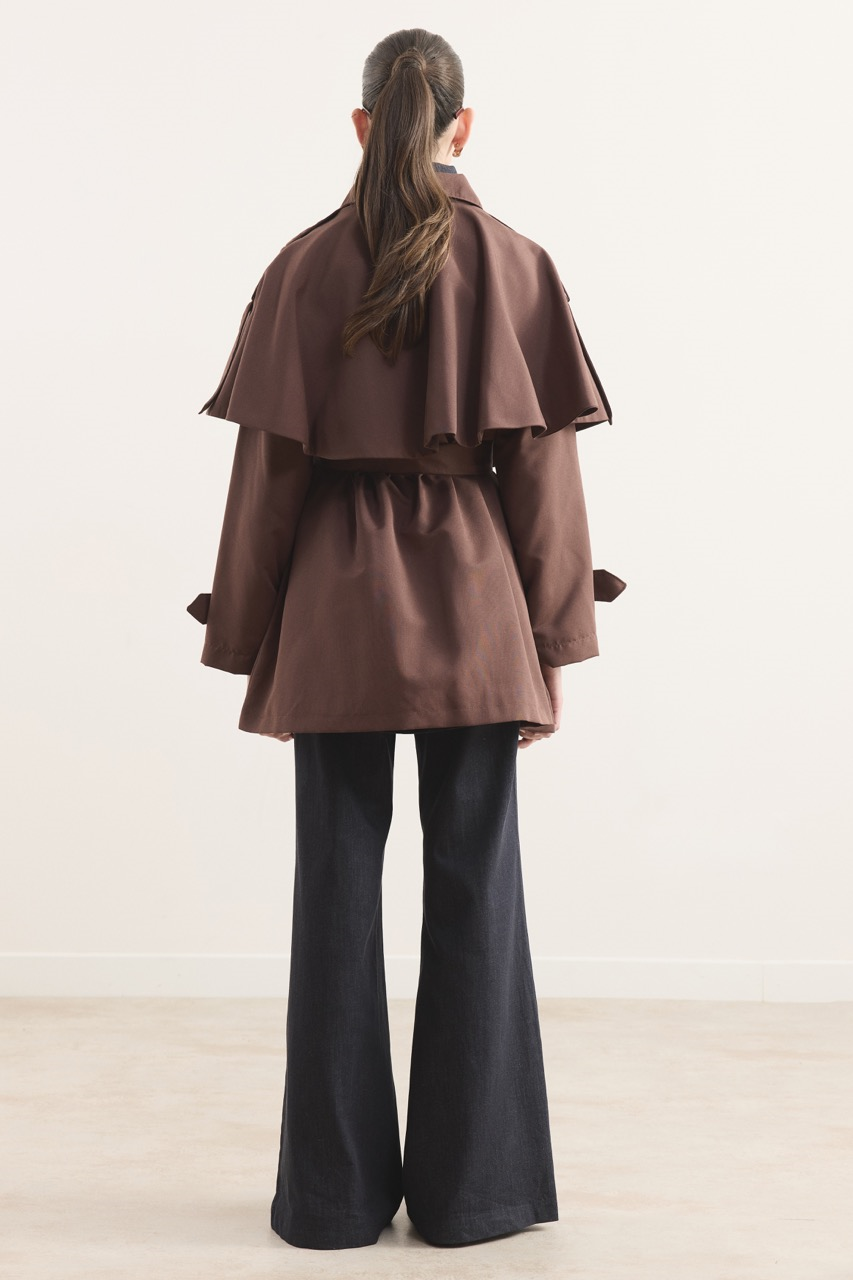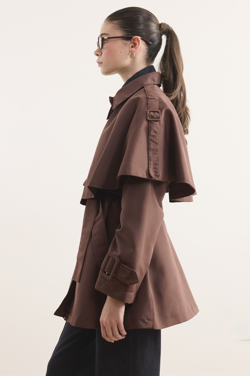 معطف ترينش قصير بتفاصيل الياقة وحزام الكم – اللون البني القهوة