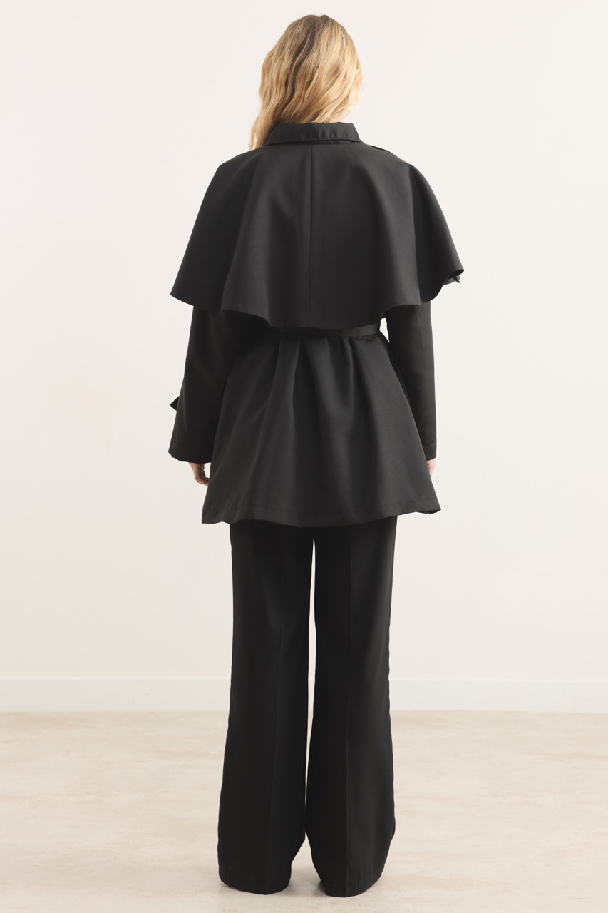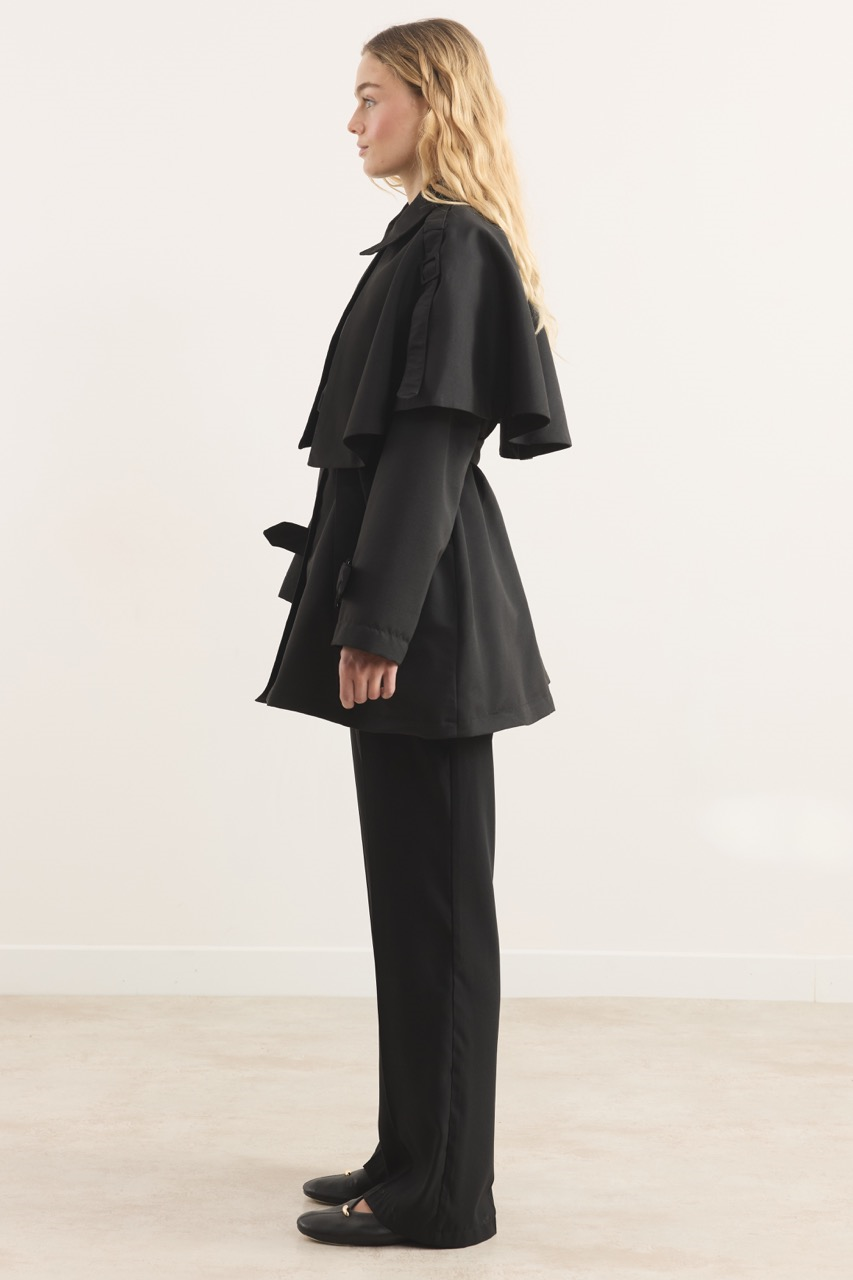 ارتقِ بأناقتك مع معطف الترينش القصير الأنيق. يتميز بتفاصيل ياقة راقية وحزام أنيق على الكم، يقدم هذا المعطف الأسود لمسة عصرية على تصميم كلاسيكي. مثالي للطقس المتقلب، يضفي لمسة من الأناقة على أي إطلالة مع توفير خيارات متعددة للطبقات.