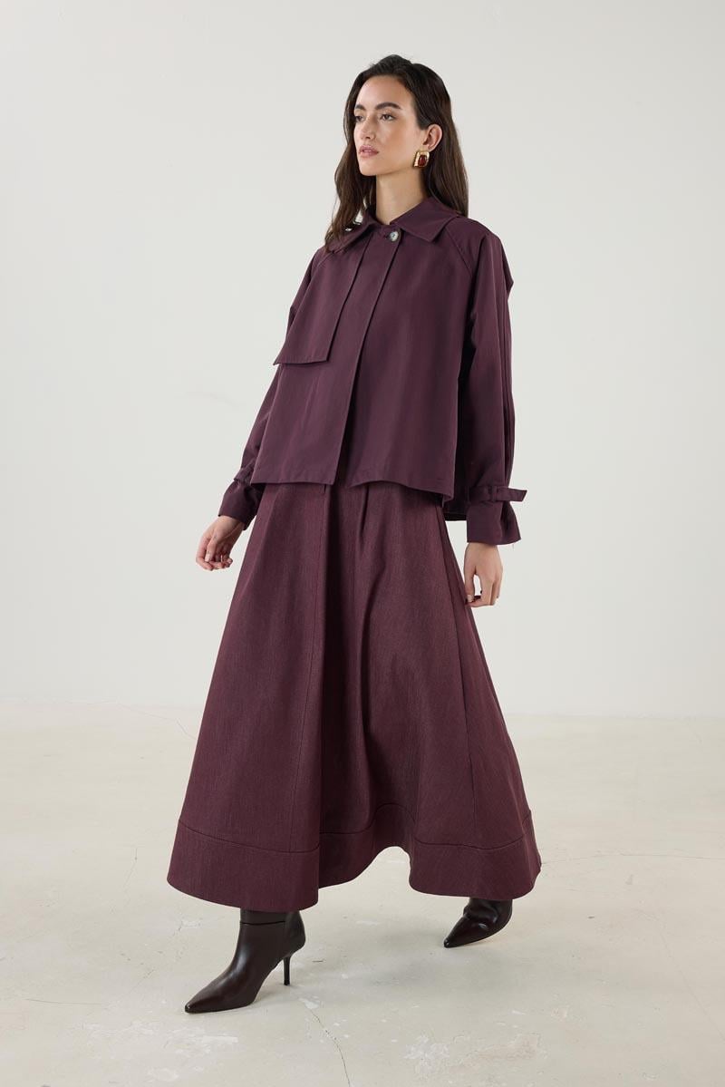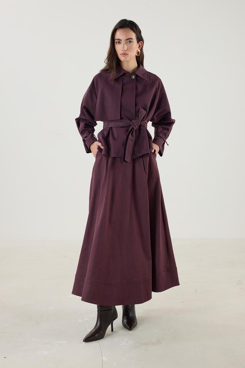 معطف ترينش قصير بحزام وجيوب بلون الموردم