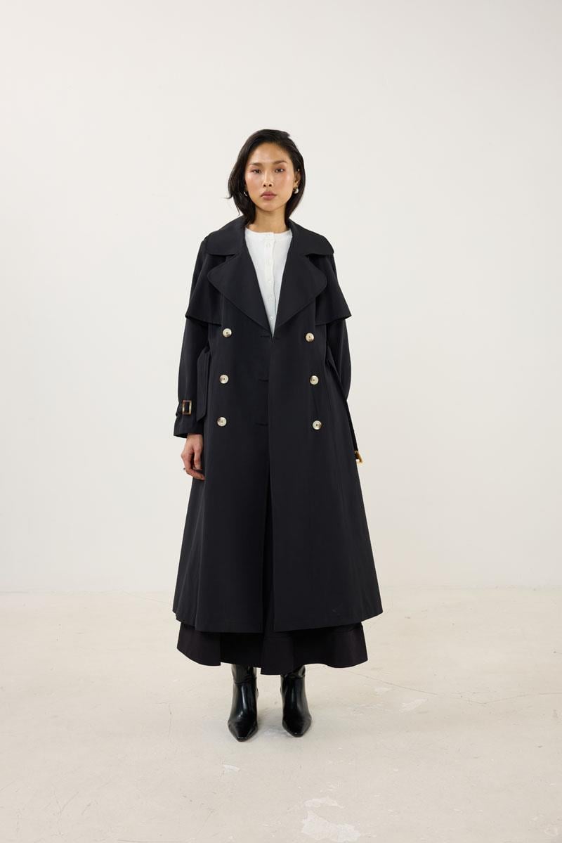 معطف ترينش كلاسيكي طويل مزود بحزام ومشبك باللون الأسود
