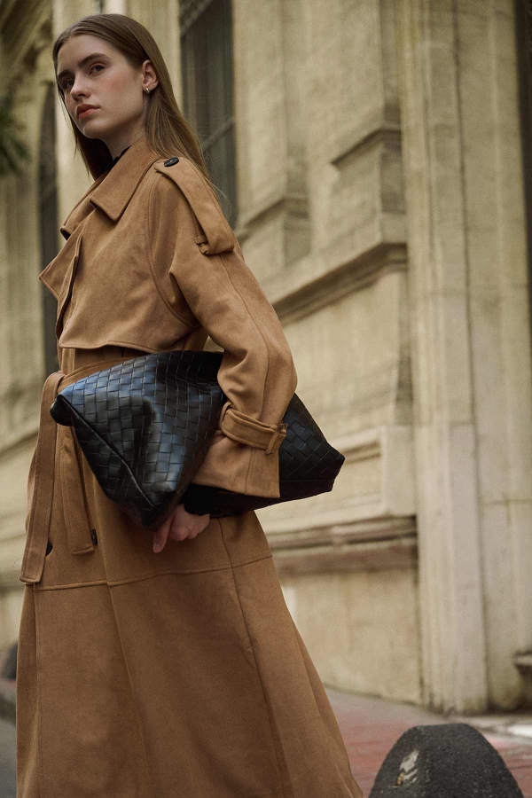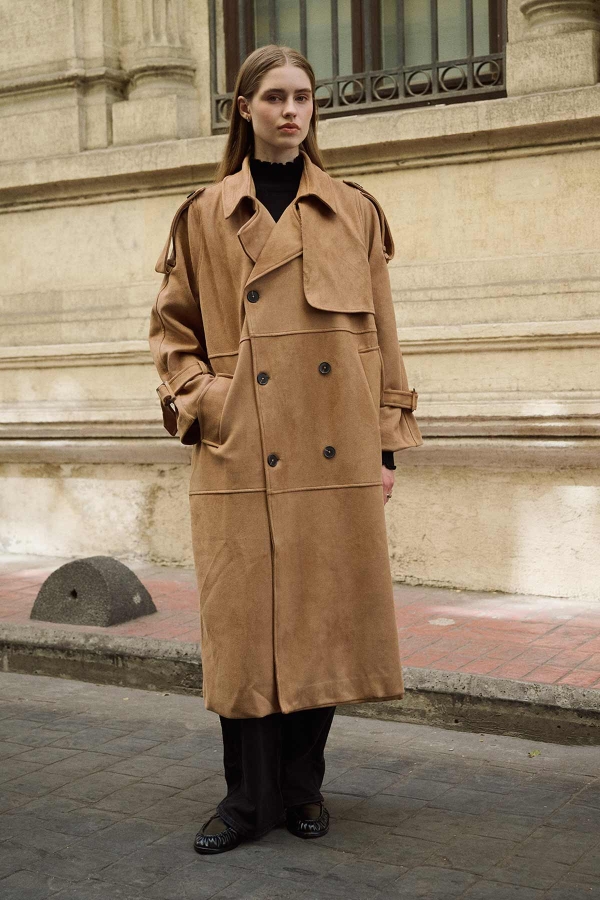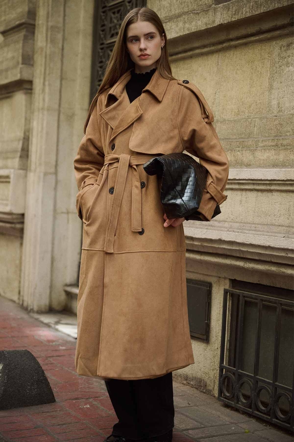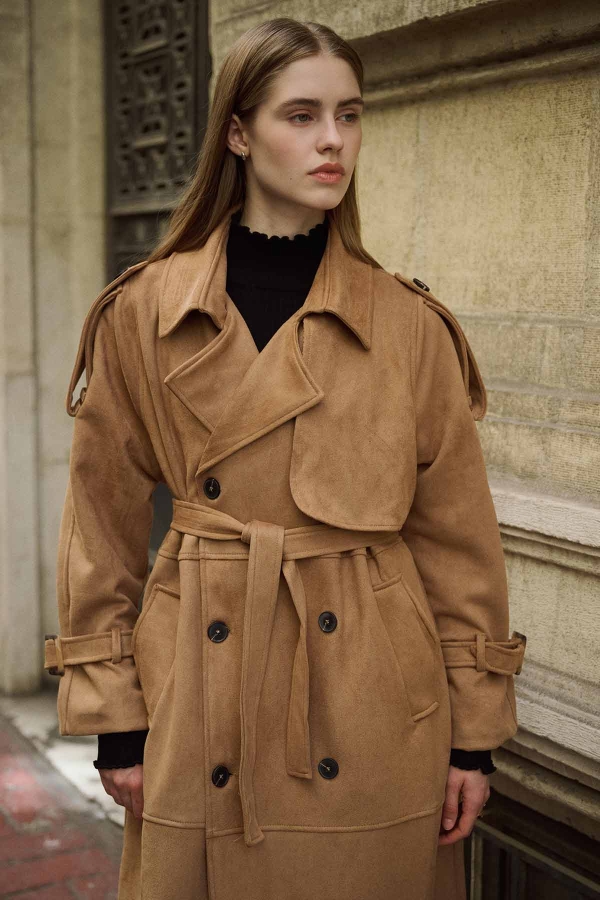 معطف ترينش من جلد الغزال بتصميم متقاطع الإغلاق، بأزرار أمامية، وفتحة خلفية، ومبطن، وحزام متحرك من نفس القماش، مع جسر للحزام، وجيوب جانبية.