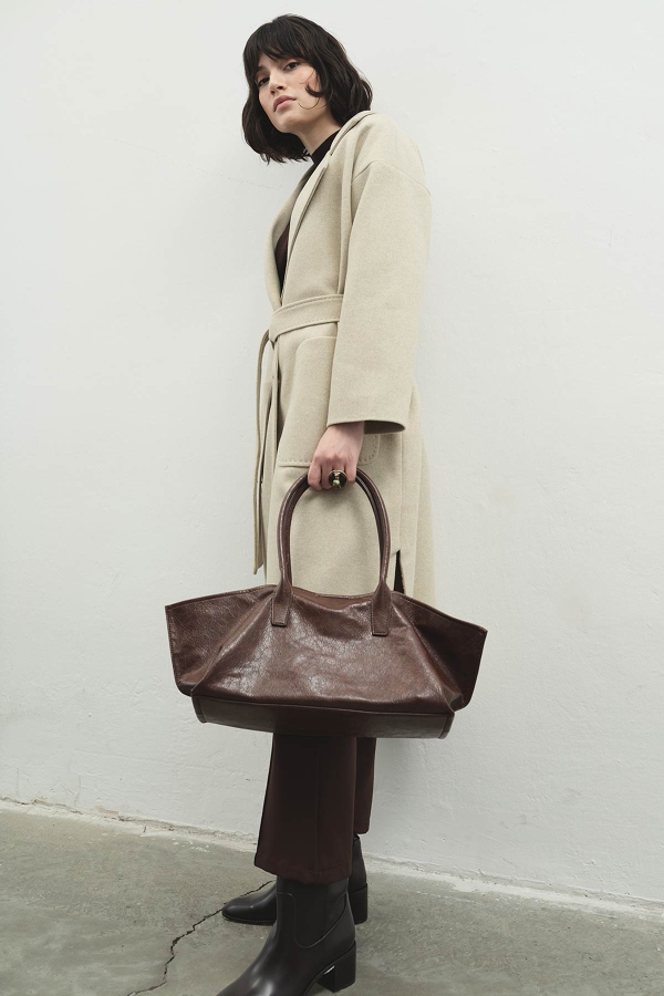 معطف ترينتش مبطن بالكتان بلون القهوة المر