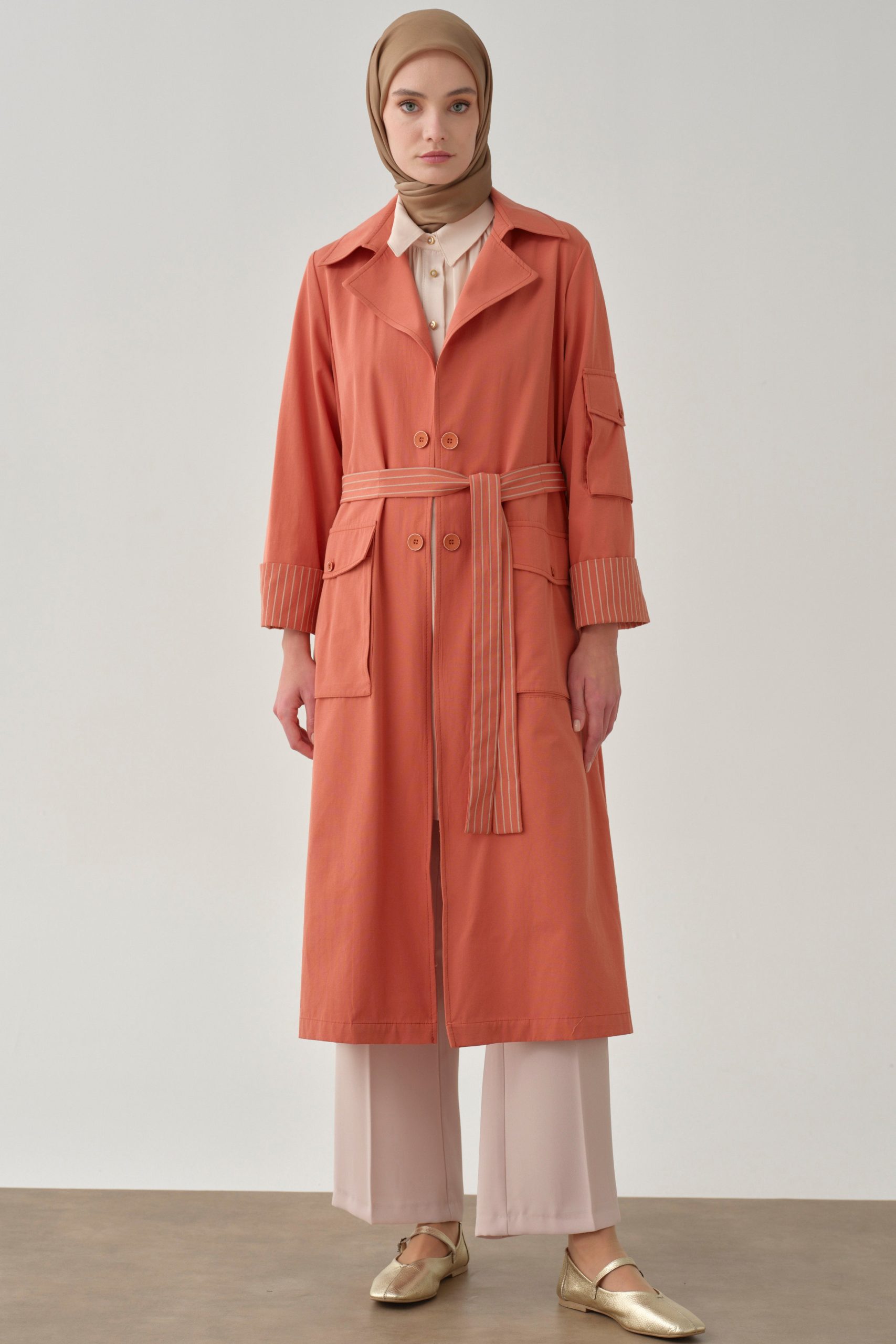 معطف خندق بطبعات مخططة وجيوب – برتقالي