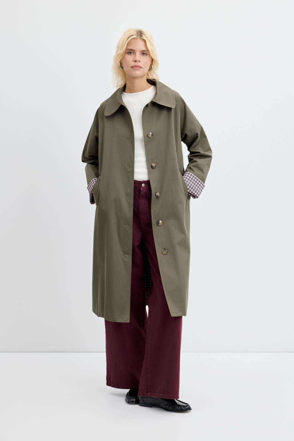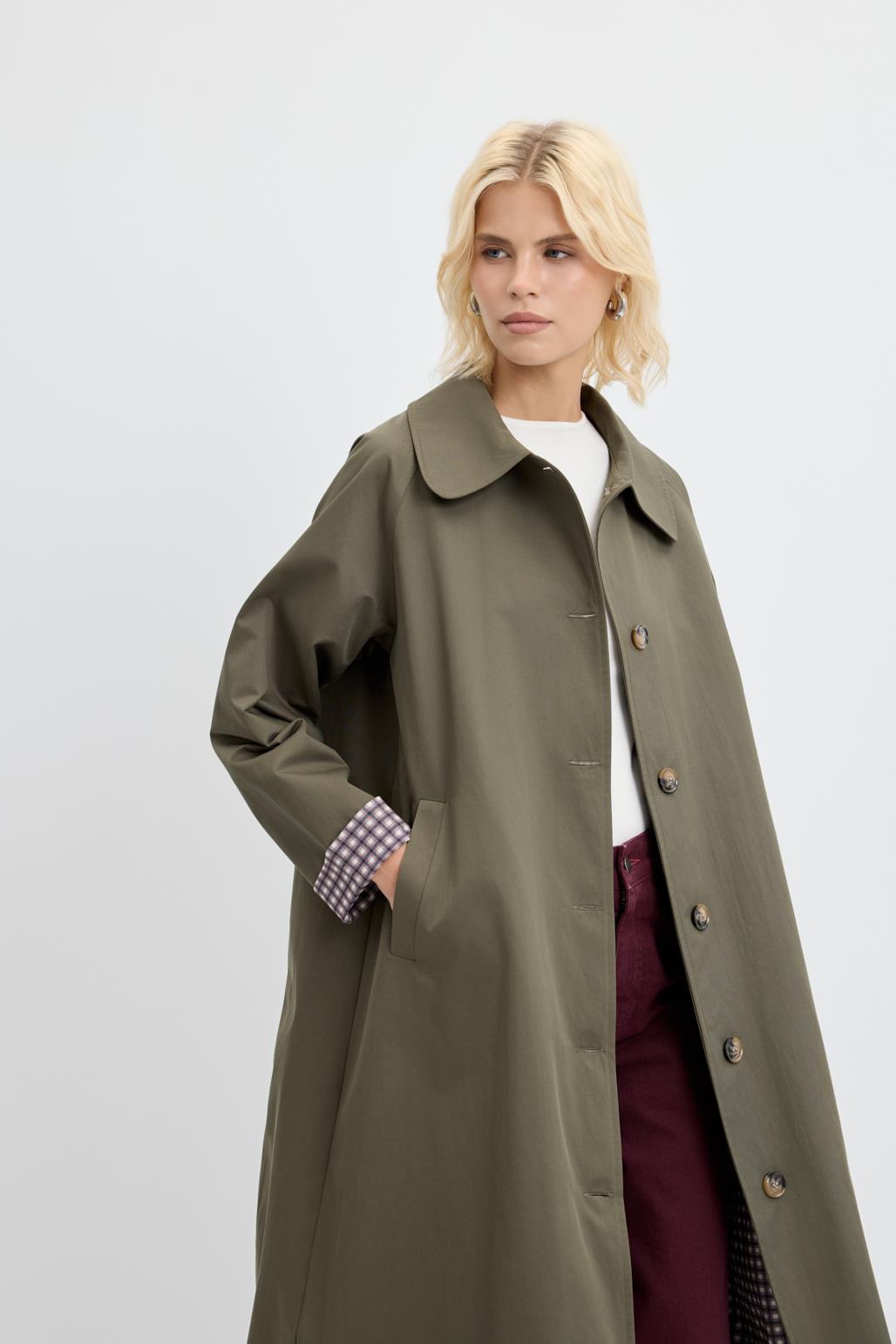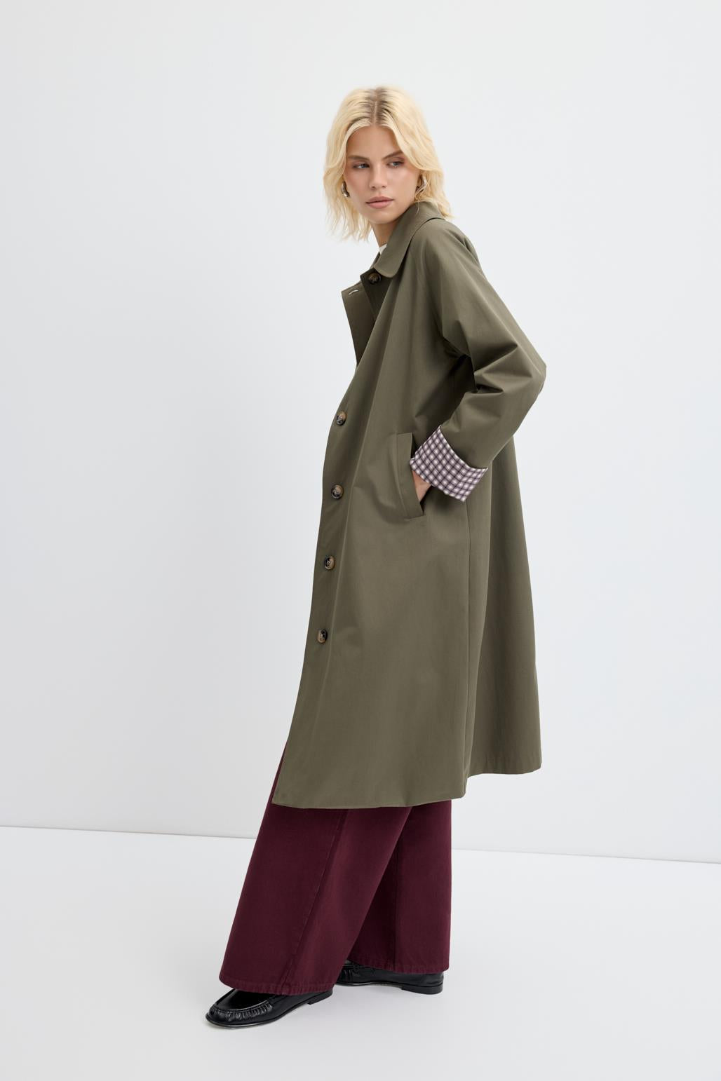 معطف خندق طويل ببطانة مربعات وحزام بلون الكاكي