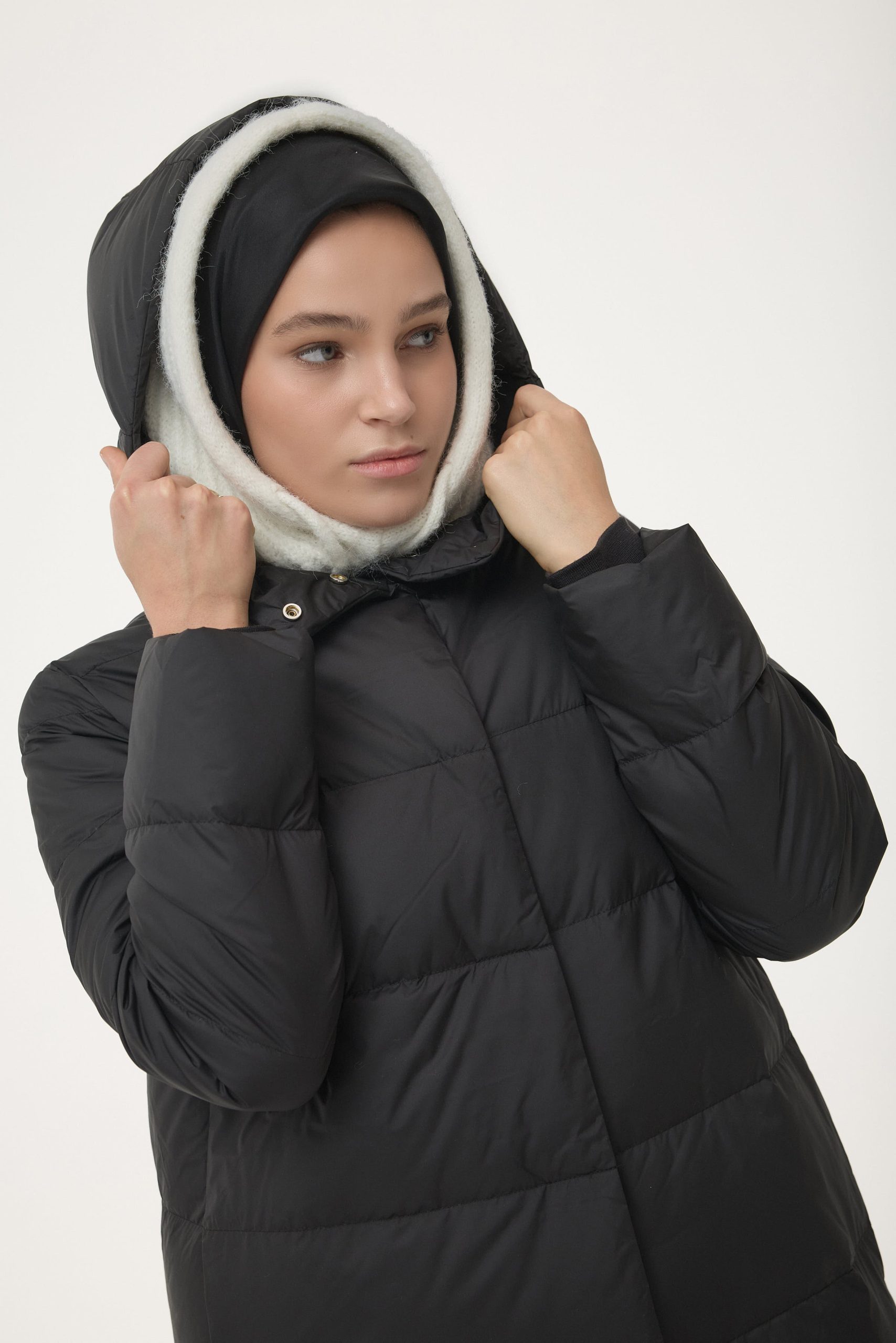 معطف ريش الإوز بتفاصيل الإغلاق المخفي – أسود