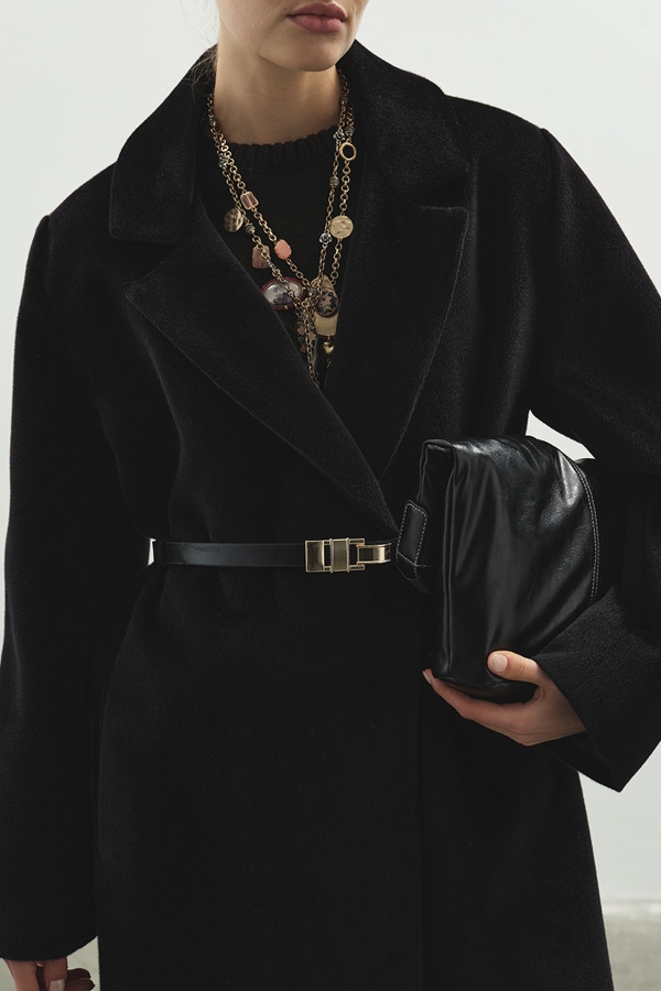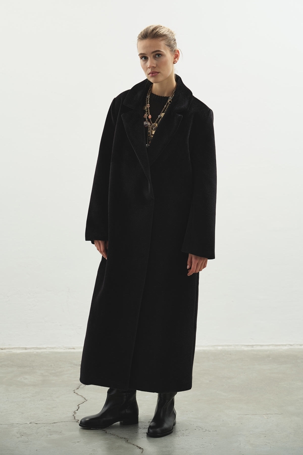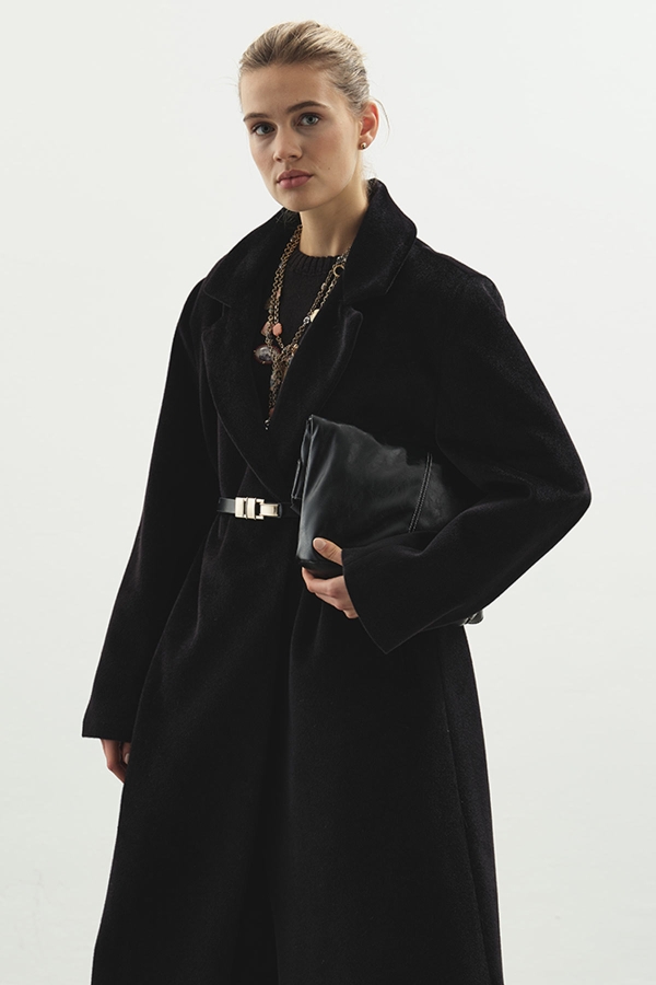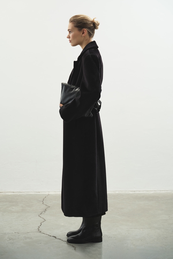 معطف طويل أسود كشميري برقبة مزدوجة