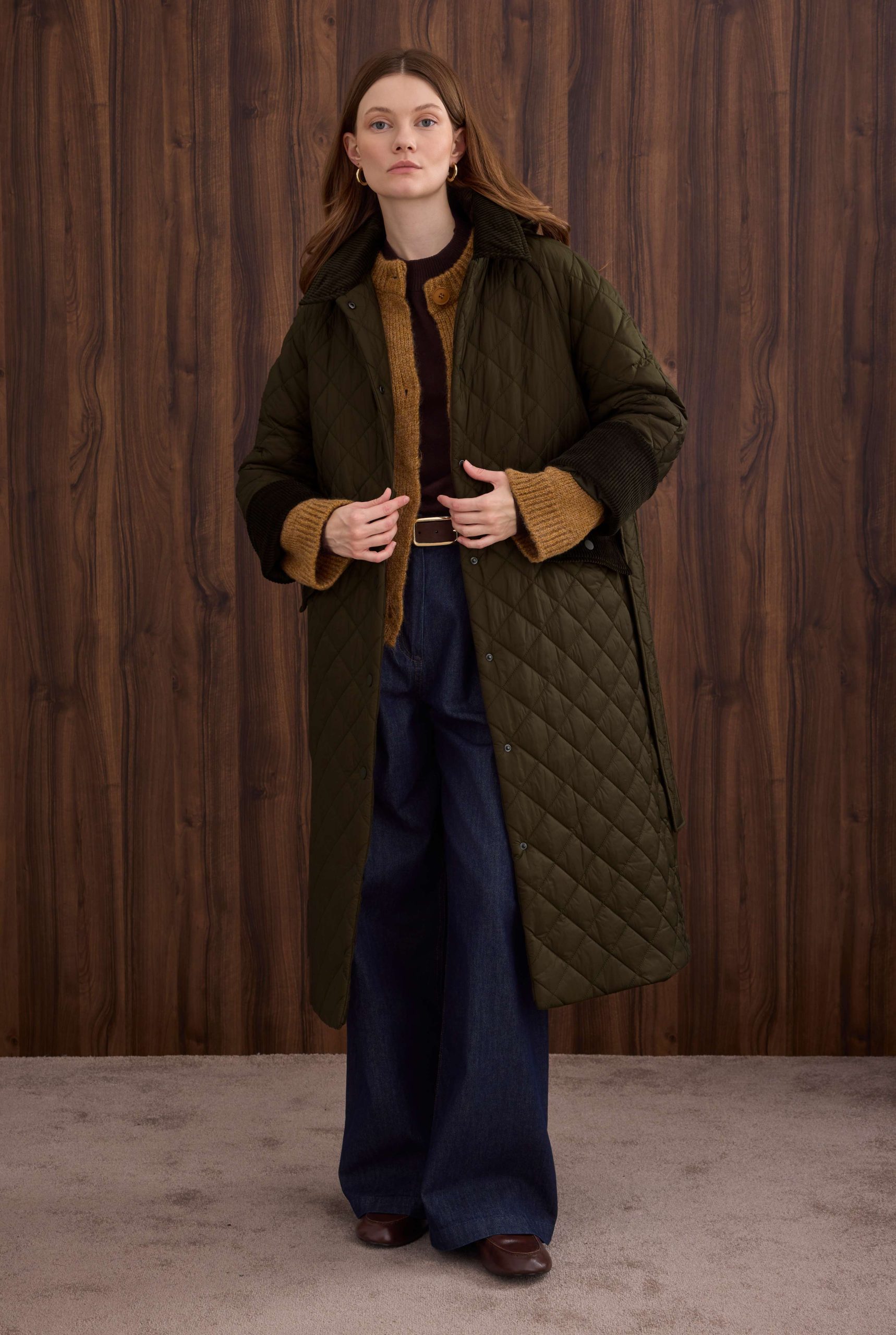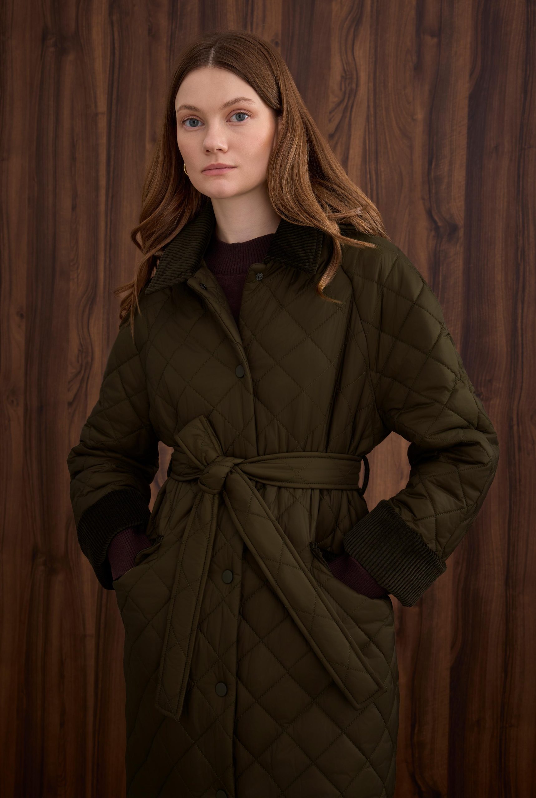 تفاصيل الخياطة المبطنة تضيف مظهراً عصرياً وأنيقاً لتصميم المعطف الكلاسيكي. القص الطويل يوفر حماية ودفئاً إضافيين، بينما خطوطه النظيفة تجعله مناسباً بسهولة للاستخدام اليومي في الأزياء الحضرية.