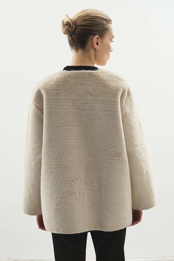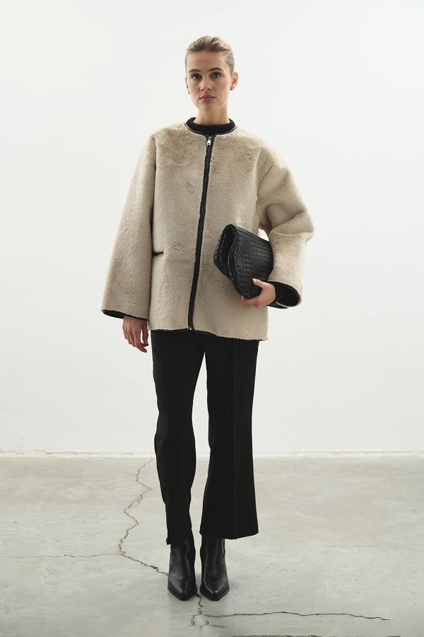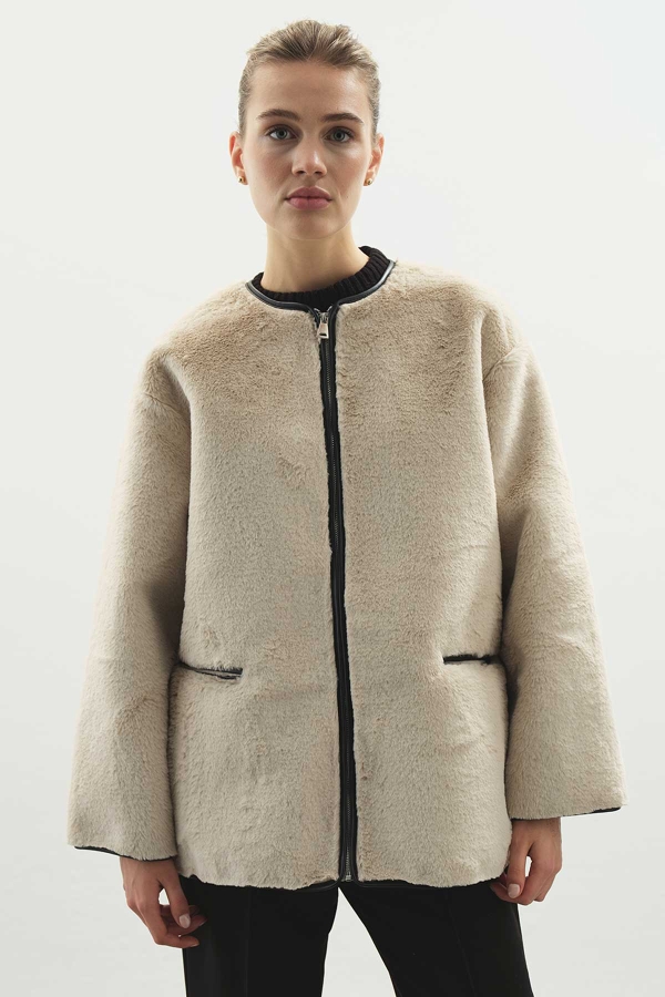 ياقة دراجة، إغلاق بسحاب، جيوب أمامية، يحتوي على حقيبة جيب بتفاصيل خياطة اختيارية يمكن فتحها بعناية للاستخدام النشط، مقاس مريح، تفاصيل جلدية من الداخل، معطف فرو صناعي بحواف جلدية متباينة بدون بطانة.