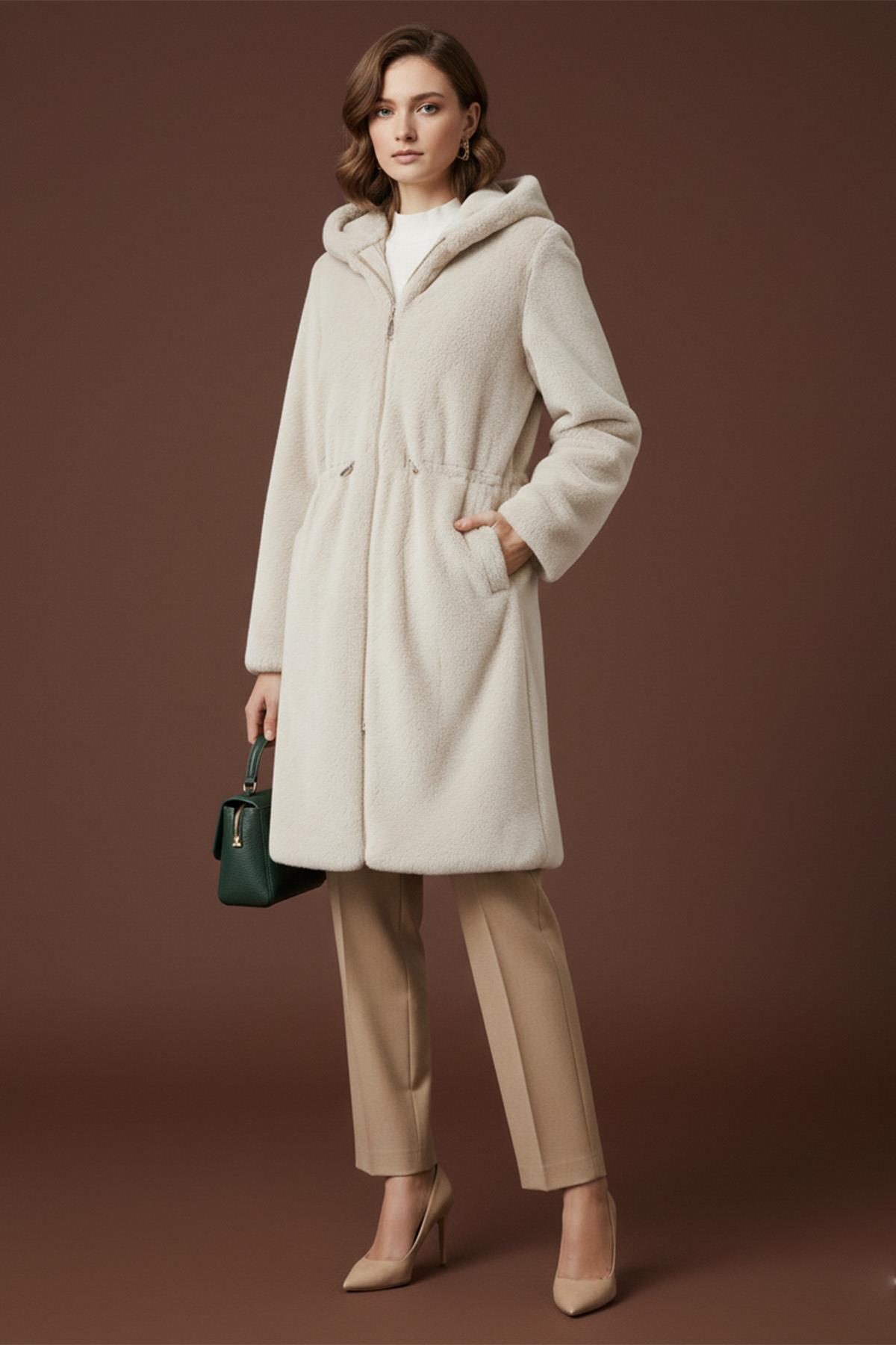 معطف فرو نسائي مع قلنسوة وحزام مطاطي – 15236KBN – STONE