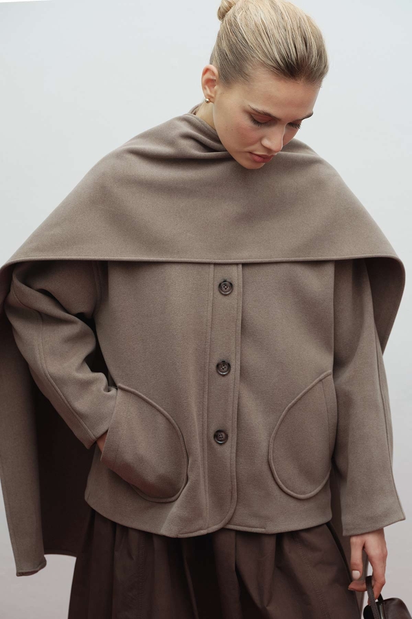 يتميز هذا المعطف بطوق وشاح، وإغلاق بأزرار أمامية، وتفاصيل جيوب خارجية، وأكتاف منخفضة، ويشمل وشاحًا من نفس القماش للاستخدام الاختياري. وهو مبطّن بالكامل ويتمتع بمظهر فاخر يشبه الكشمير.
