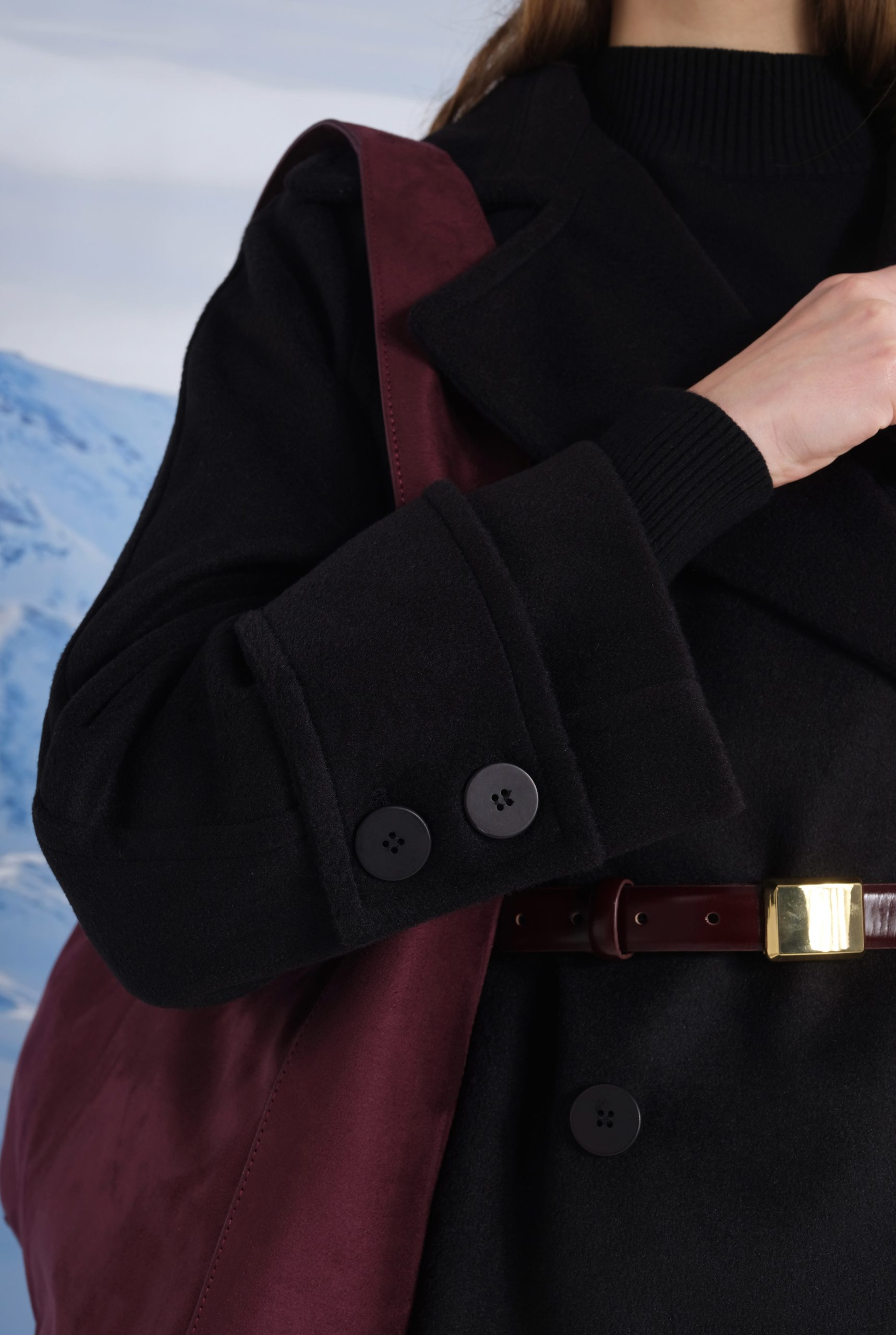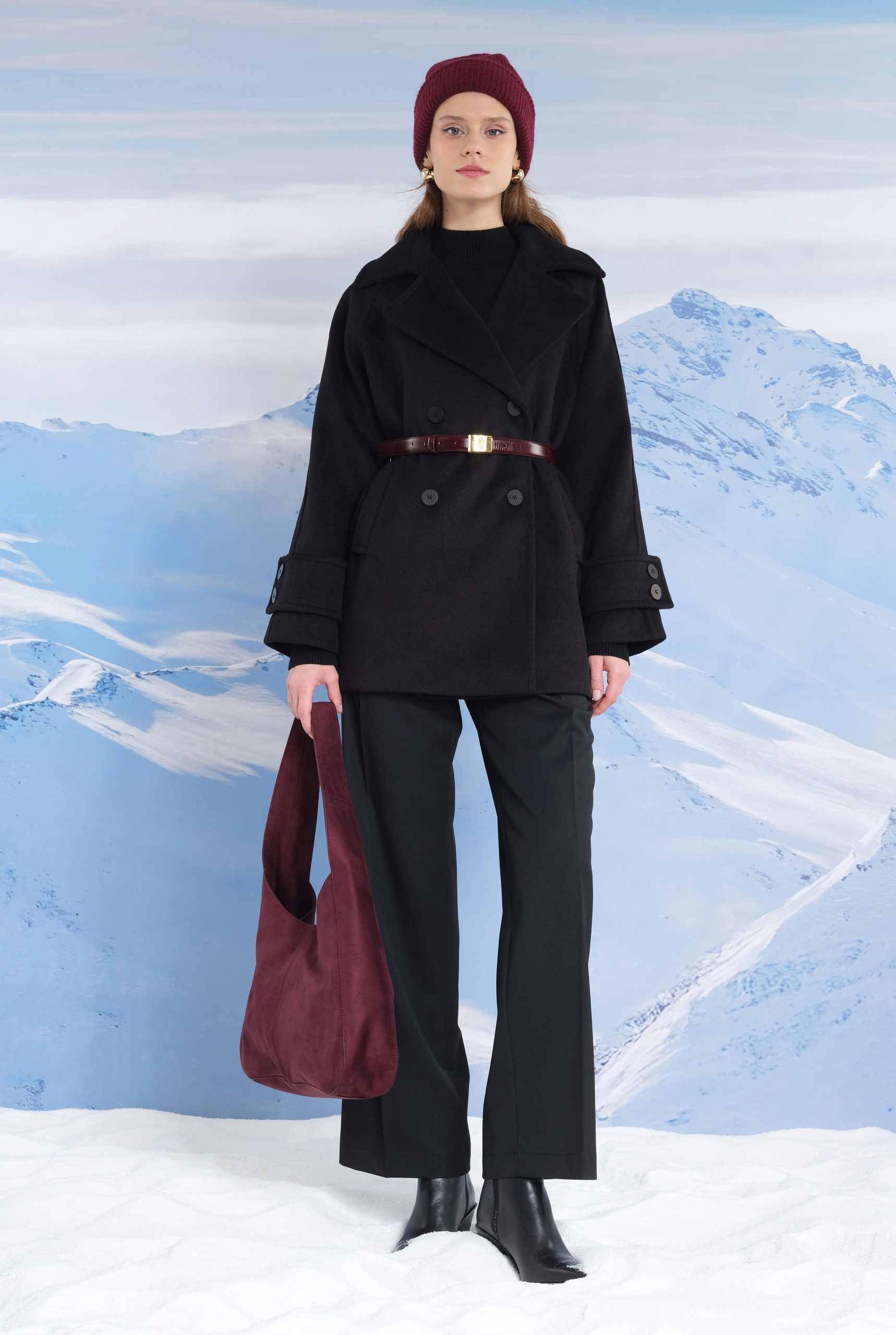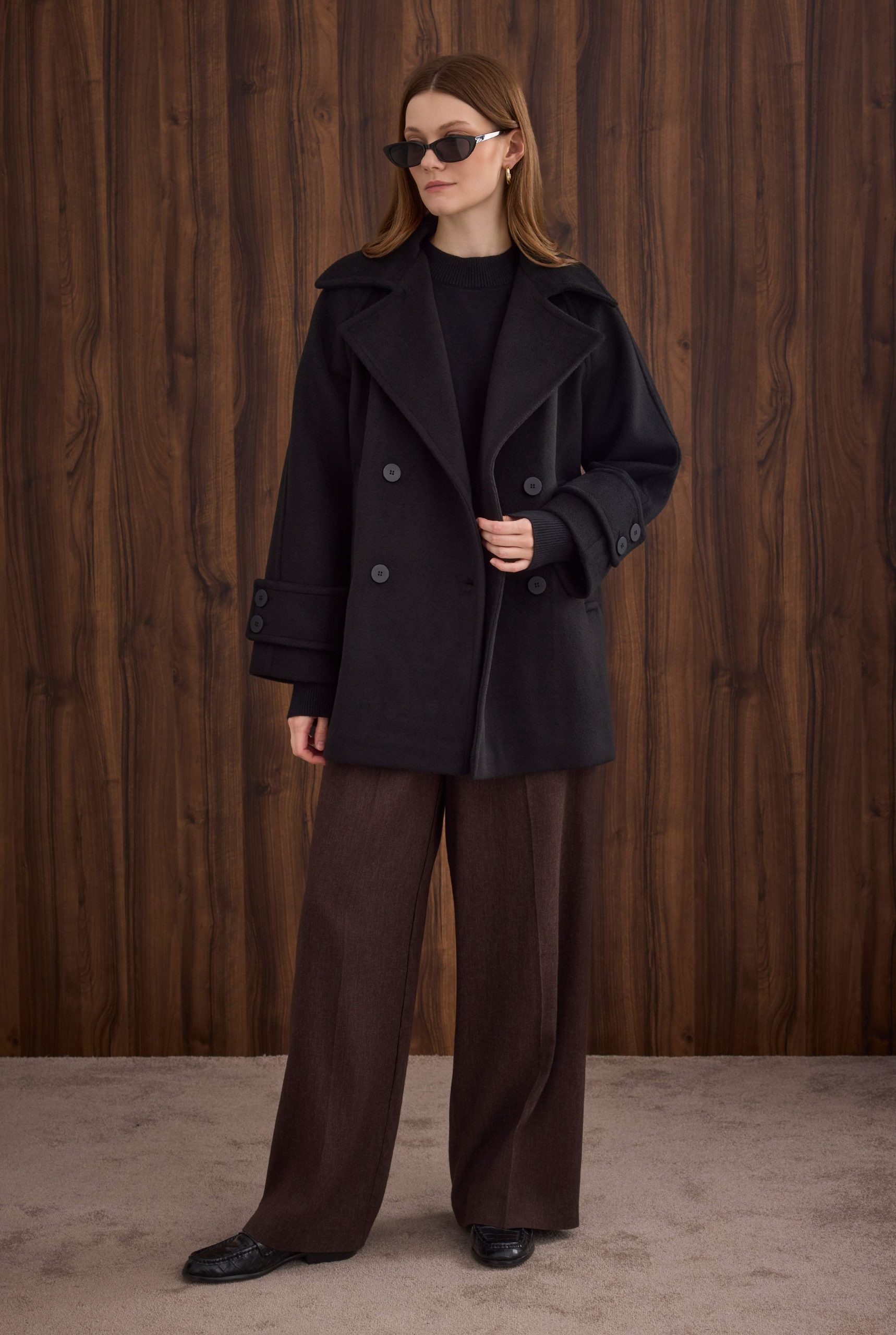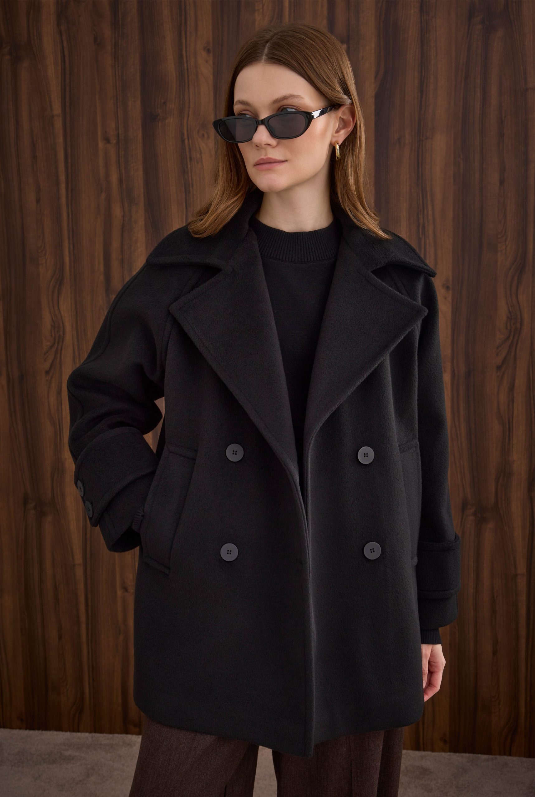 معطف قصير مزود بأزرار مزدوجة باللون الأسود