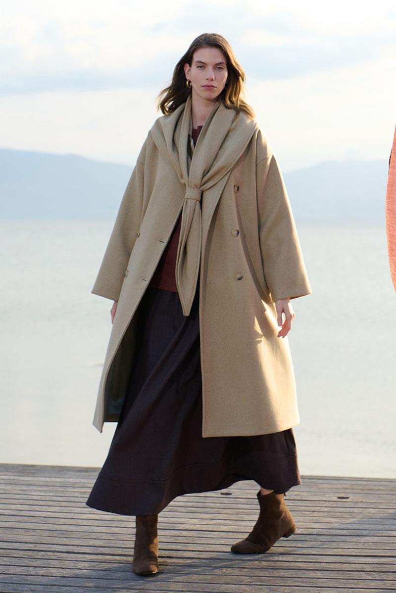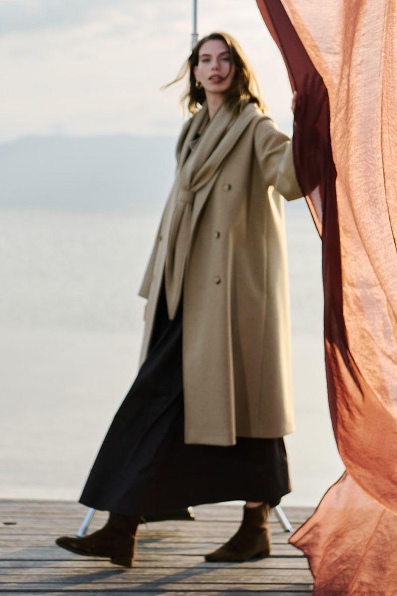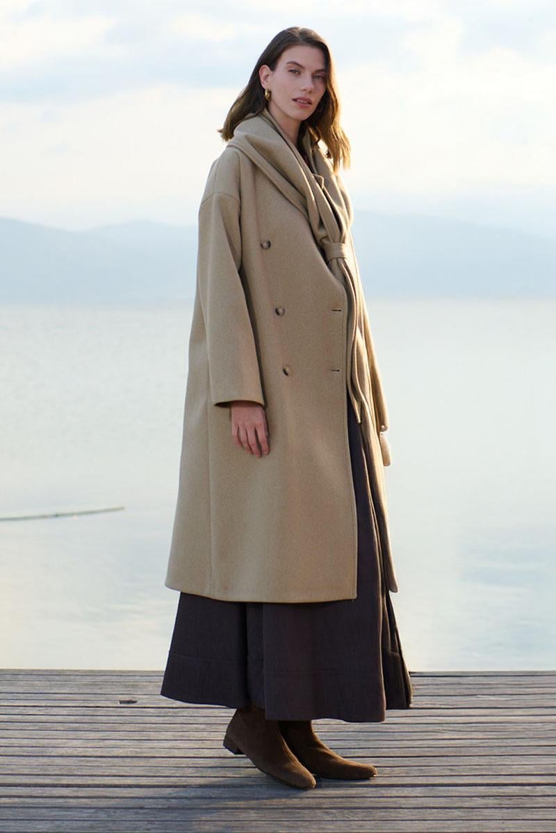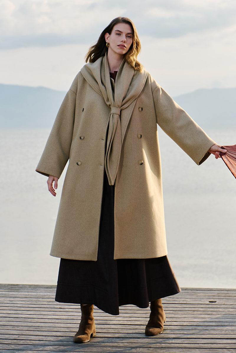 يقدم هذا المعطف المصنوع من خليط الصوف ملمسًا دافئًا وناعمًا، بينما يعمل حزام الخصر على إبراز القوام بأناقة. خطوطه النظيفة تخلق بساطة عصرية، وشكله المتدفق يضيف أناقة طبيعية ومتطورة للستايل الحضري.
