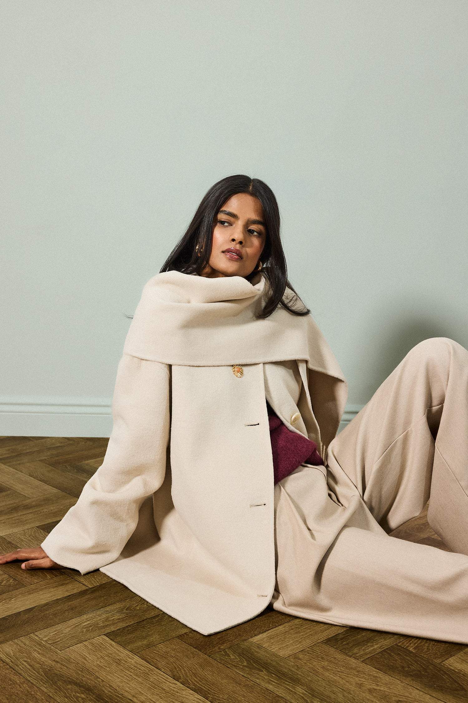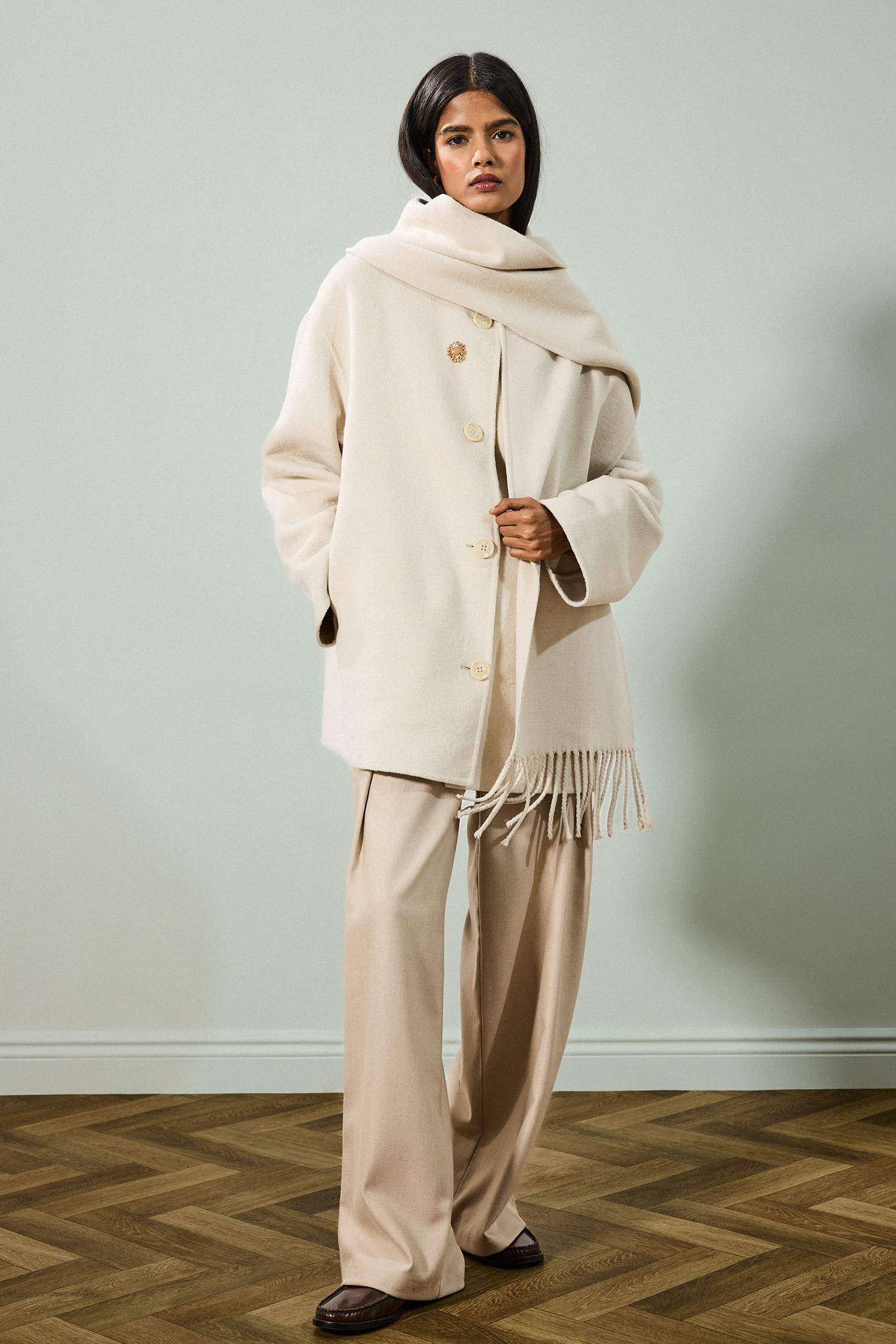 معطف كشمير بطول كامل بأزرار ووشاح قابل للإزالة بتصميم مريح من خليط الصوف