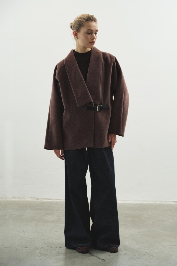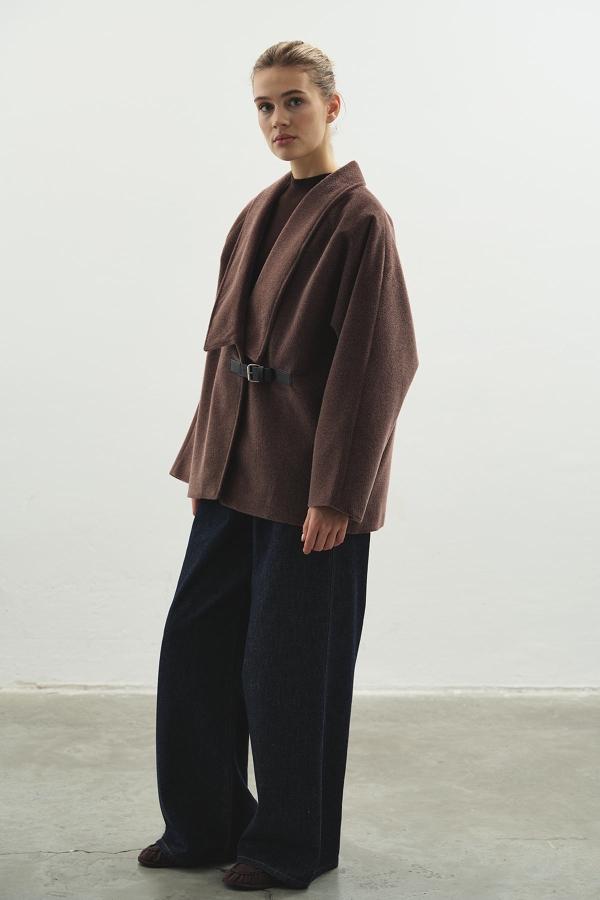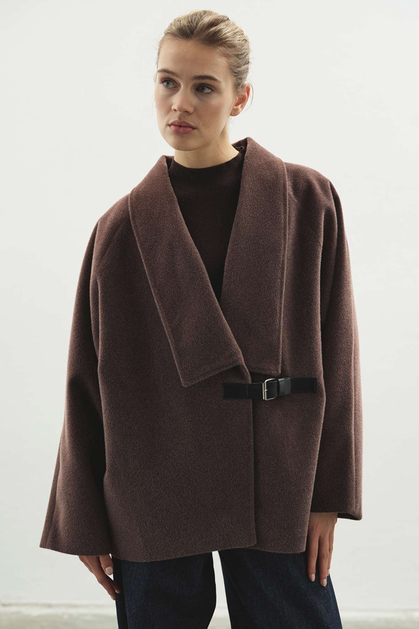 معطف كشمير بني بحزام معدني
