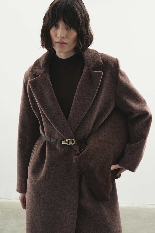 مميزات المعطف الطويل المزدوج الصدر من الكشمير البني: ياقة سترة، إغلاق مزدوج الصدر، تفاصيل أزرار مخفية، جيوب جانبية، إكسسوار حزام، مقاس عادي، معطف كشمير طويل مزدوج الصدر مبطن. المادة والغسيل: 50% نايلون، 50% بوليستر. يُنصح بالتنظيف الجاف. قد تختلف القياسات اليدوية بمقدار 2-3 سم. مقاس العارضة: صغير. قياسات العارضة: الطول: 177 سم، الصدر: 83 سم، الخصر: 61 سم، الوركين: 91 سم.
