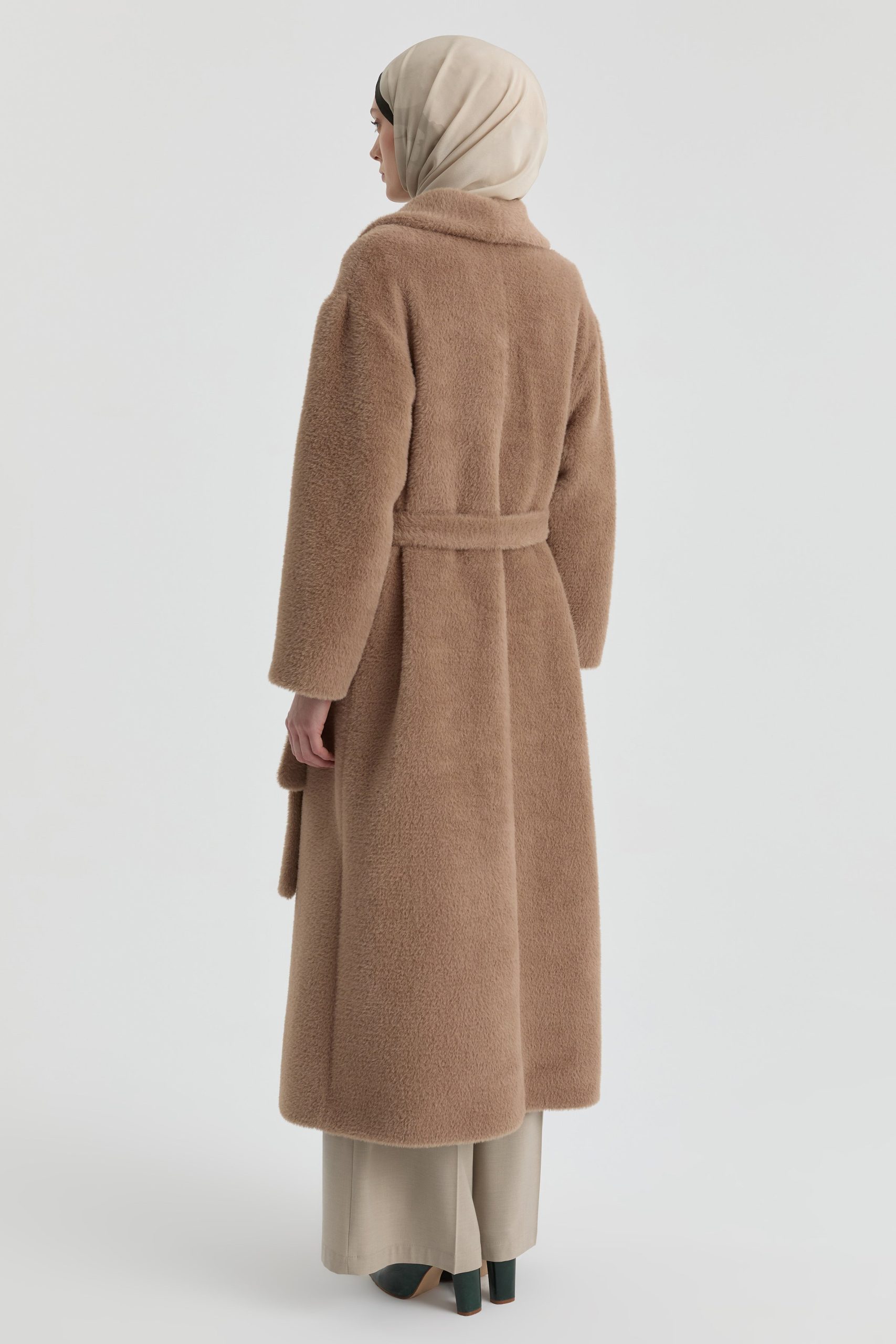 يقدم هذا المعطف المصنوع من خليط الصوف ملمسًا دافئًا وناعمًا، بينما يعمل حزام الخصر على إبراز القوام بأناقة. خطوطه النظيفة تخلق بساطة عصرية، وشكله المتدفق يضيف أناقة طبيعية ومتطورة للستايل الحضري.