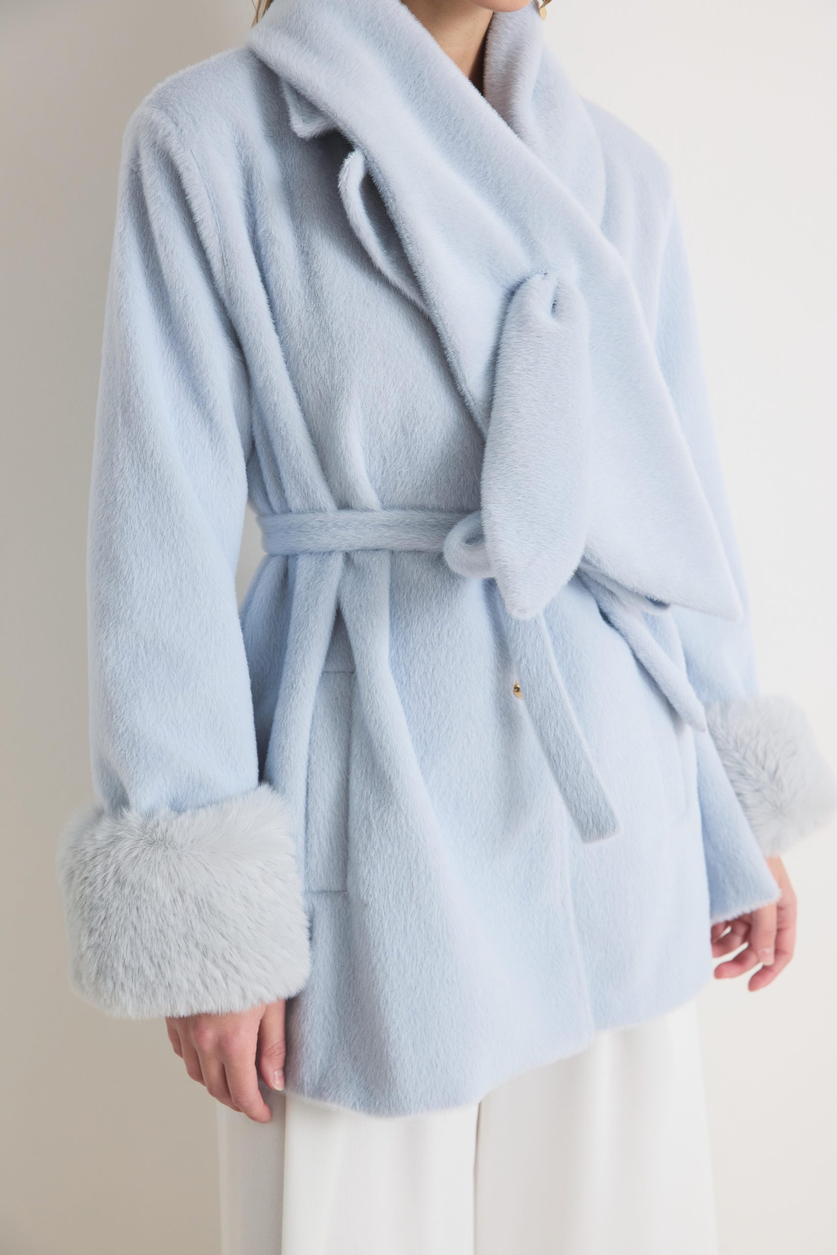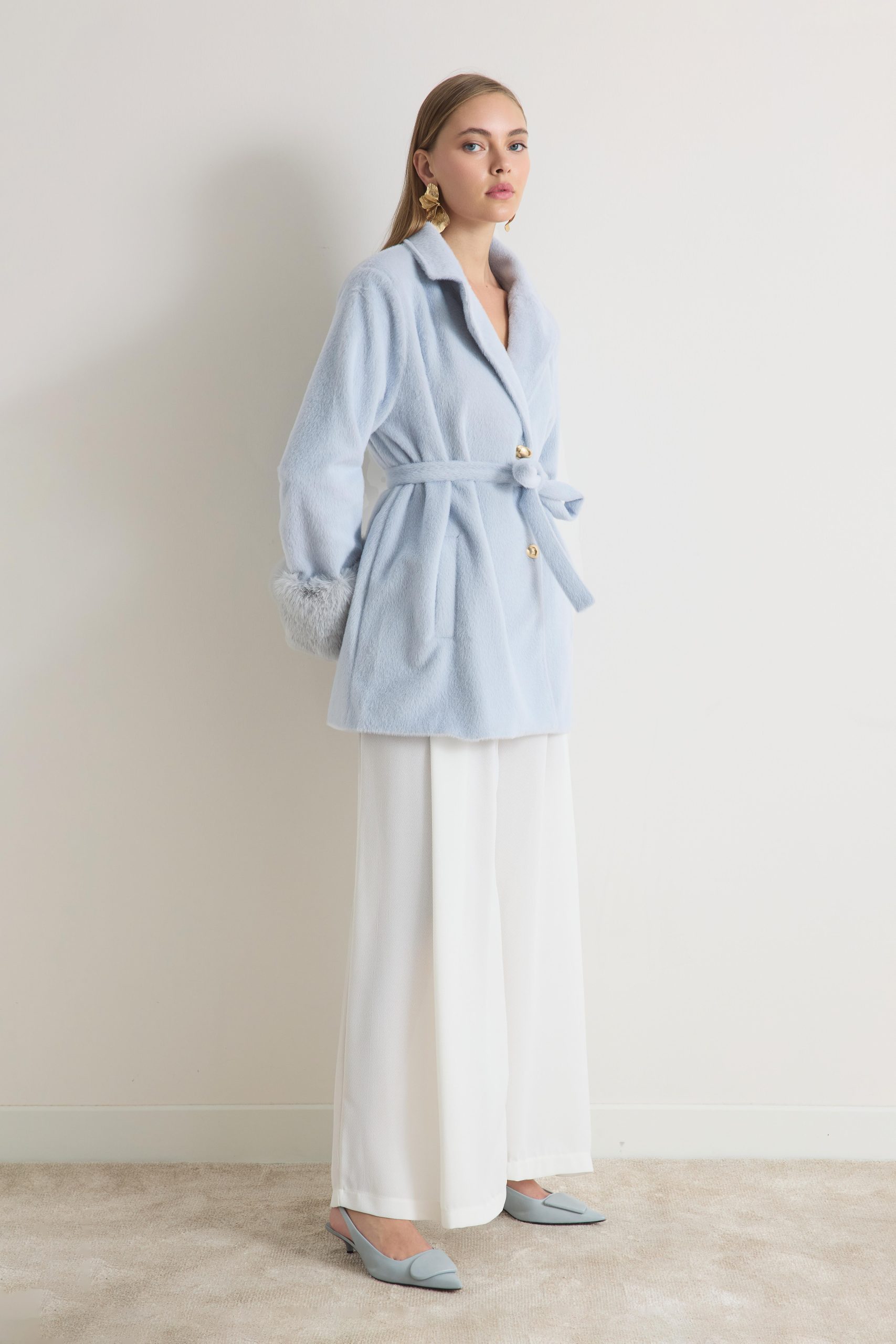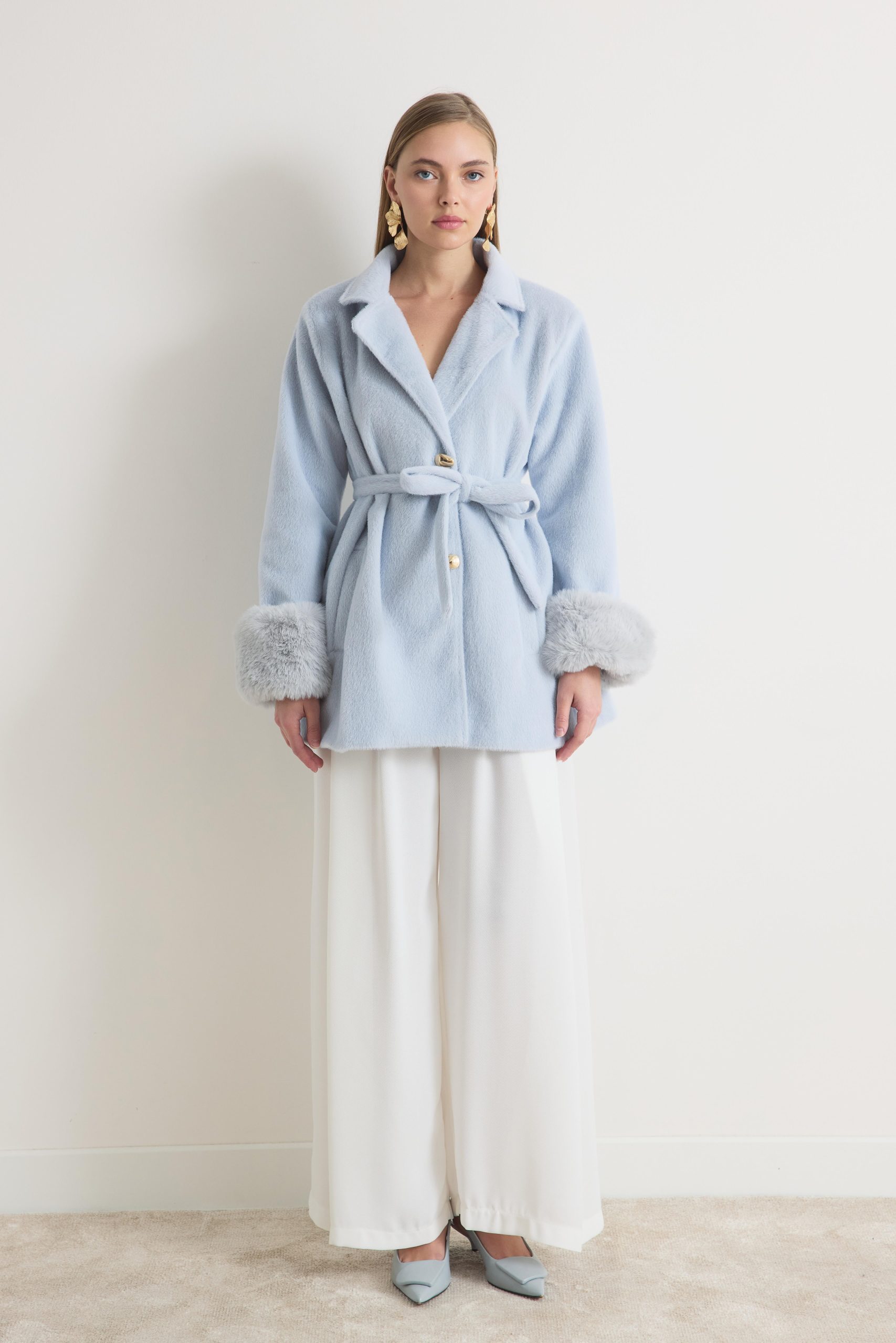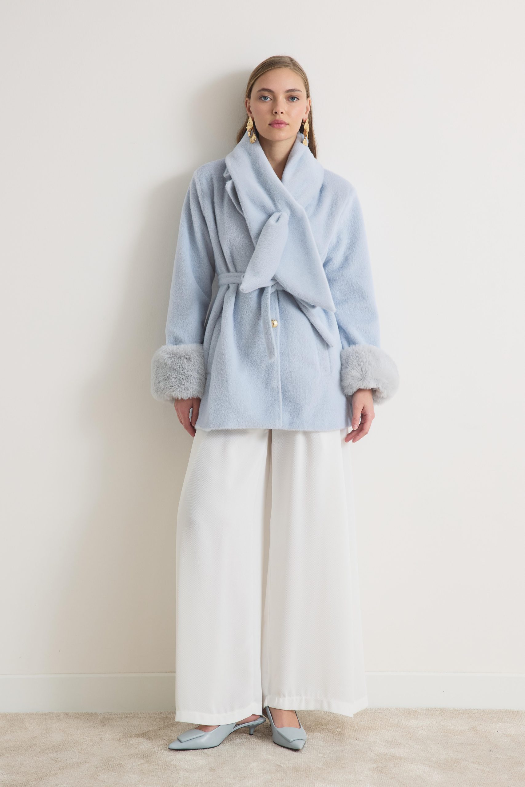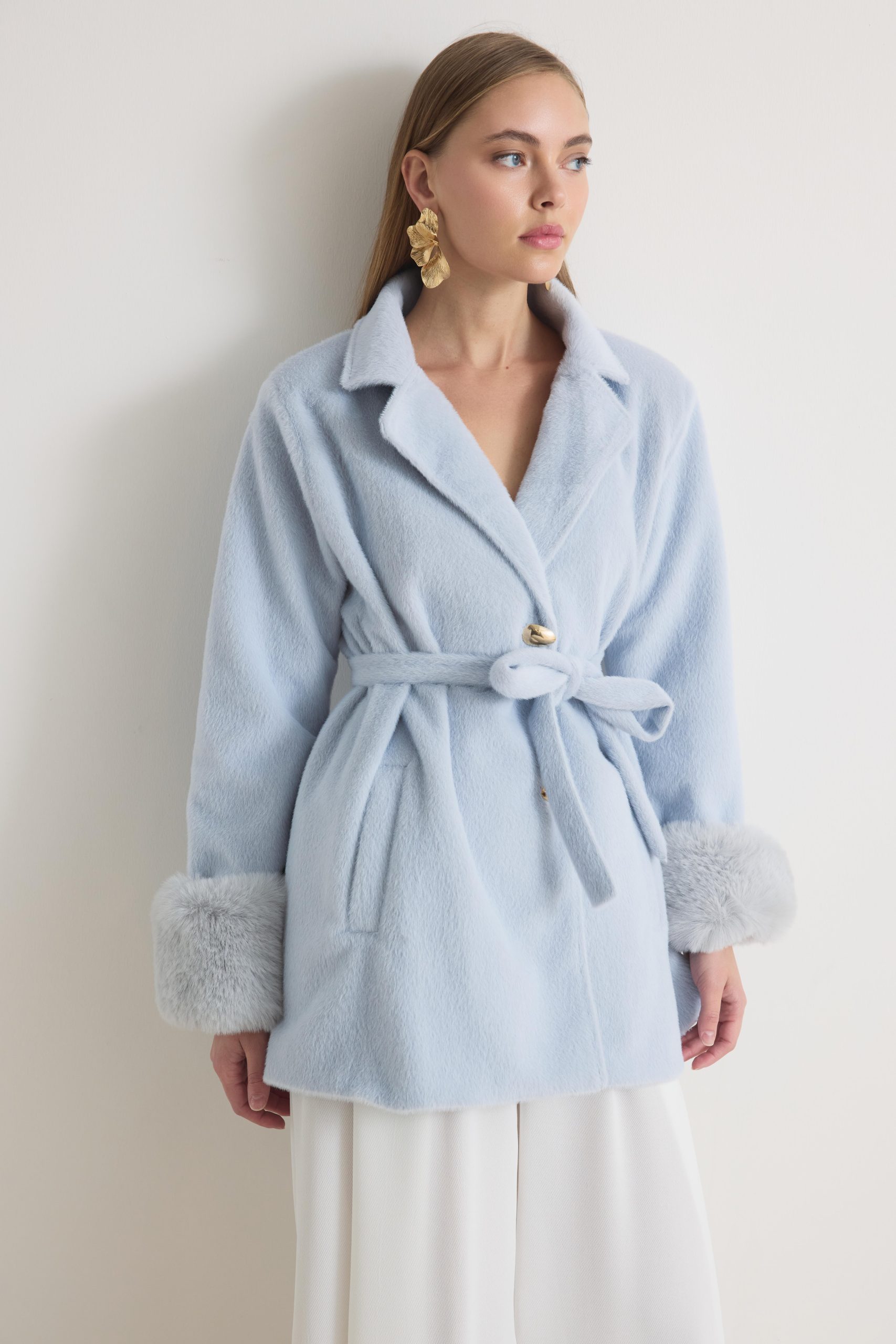 معطف ميرينا المخملي ذو الياقة المزينة بالفرو – أزرق فاتح