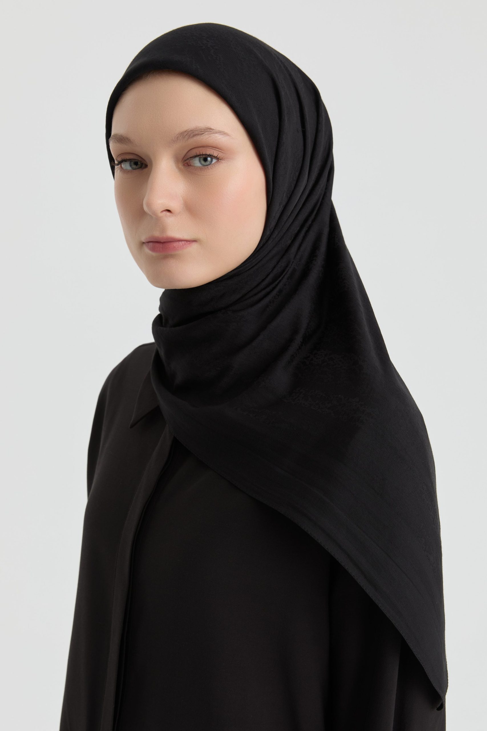 يبرز وشاح جاكار الساحر الأناقة البسيطة من خلال النقوش الدقيقة المنسوجة في القماش. تضيف بنية نسيج الجاكار عمقًا خفيفًا للوشاح بينما يمنحه المظهر غير اللامع مظهرًا أنيقًا ونقيًا.