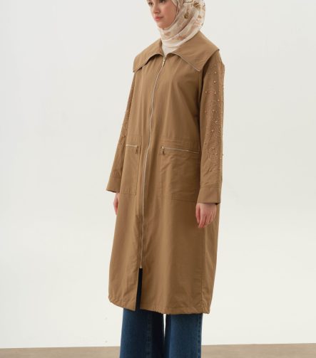معطف خندق مطرز ومزين باللؤلؤ – لون الجمل