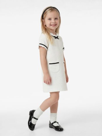 فستان فتاة بأكمام قصيرة وخط عنق مستدير وجيوب وتفاصيل ربطة