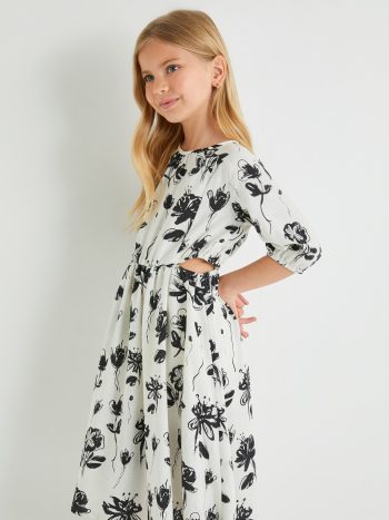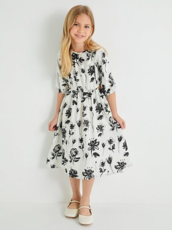 فستان كتان للبنات بتصميم زهري وأكمام منفوخة ورقبة مستديرة