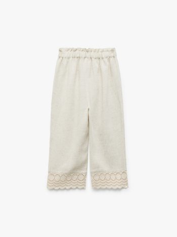 بنطلون بناتي من خليط الفسكوز والكتان مزين بالتطريز ومطاطي الخصر