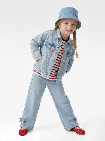 بنطلون الجينز القطني بتصميم الأرجل العريضة يتيح للصغيرات الحركة بحرية وراحة. تضيف تفاصيل الأربطة اللطيفة على الأطراف لمسة جذابة ومفعمة