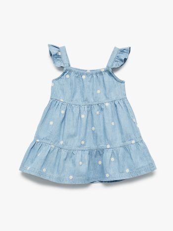 يتميز هذا الفستان بلا أكمام بتفاصيل زهرية بارزة مع قماش قطني ناعم. يمنحه قصه المريح الذي يوفر حرية الحركة وتصميم