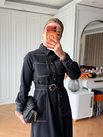 هذا الفستان مصنوع من قماش الدنيم. يتميز بتفاصيل جيوب مزدوجة مع أغطية. يحتوي الفستان على فتحة أمامية نصفية مع حزام